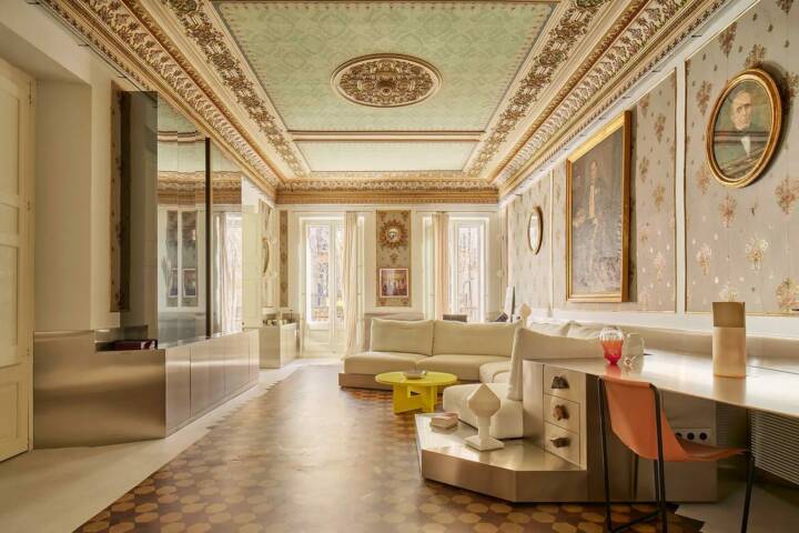 4. The floors are made by recycling waste stone pieces cast in concrete terrazzo. Black kadappa, white marble, and pink marble are all used in different areas in different forms to make the flooring a large artwork. Bedroom and bathroom floors are done in small broken tile chips laid in cement that gleam and reflect the sunlight brightening up these spaces.