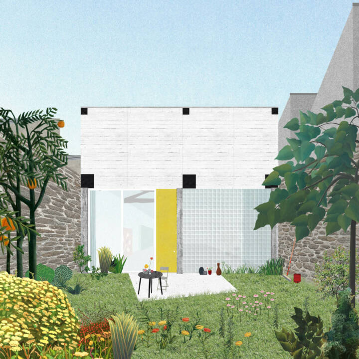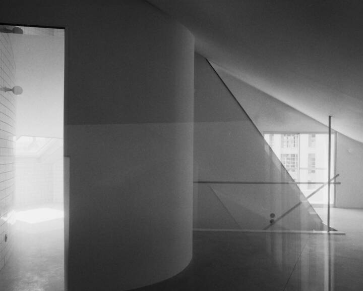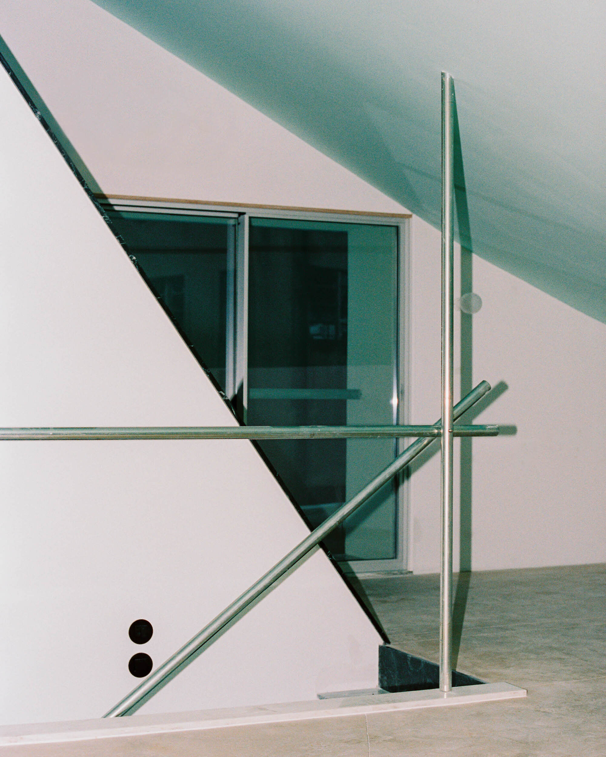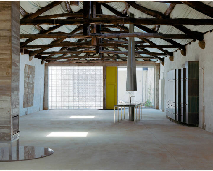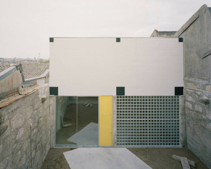 Reoccurring pairs of windows, yellow doors, green shutters and surfaces of glass brick correspond to intricate rooms, devise tense compositions and charismatic personas. the former warehouse is a house of many faces.