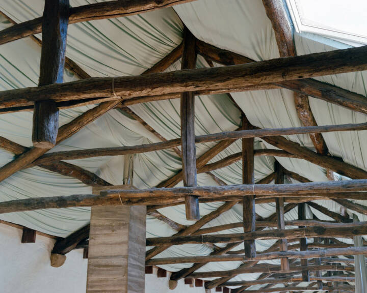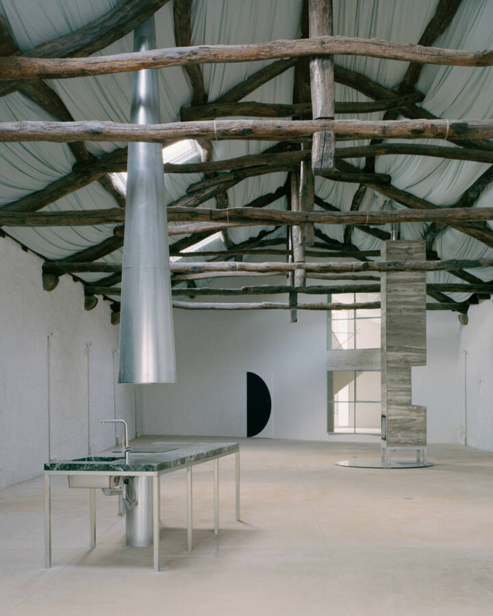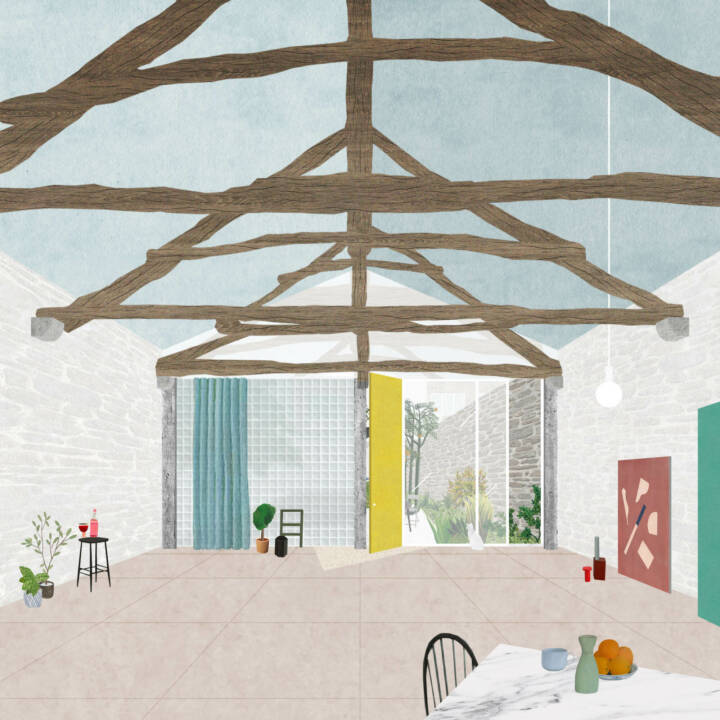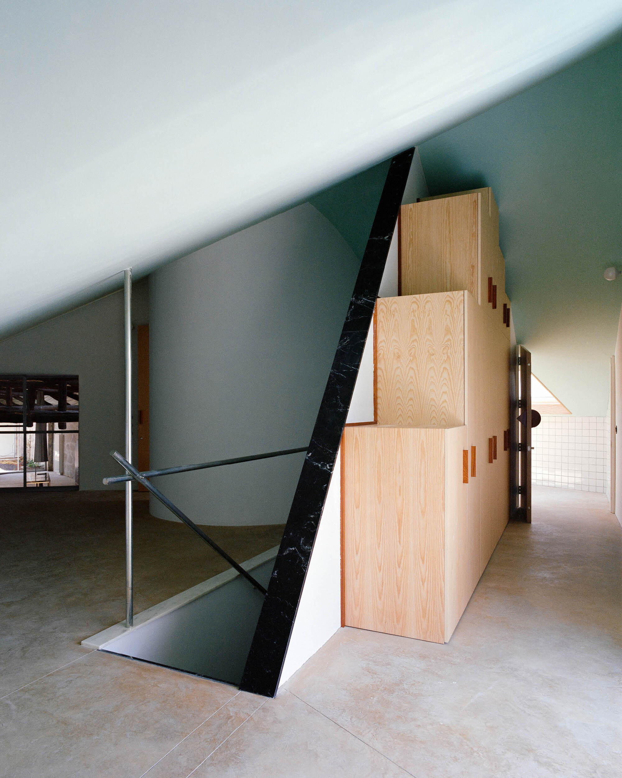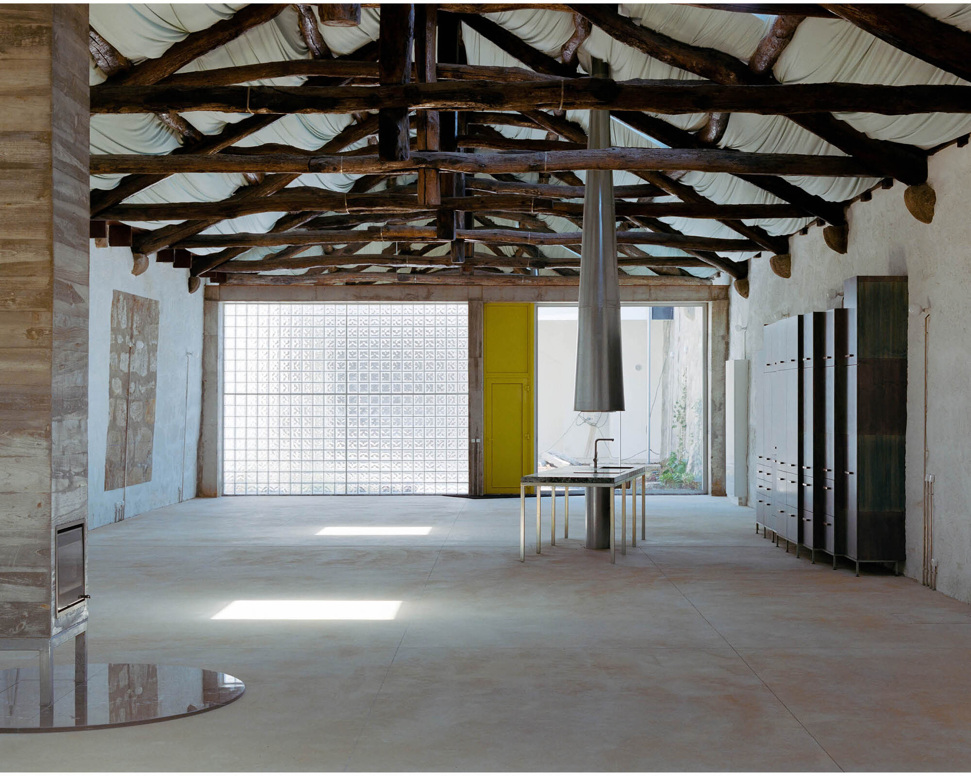 The structure of the existing building suggests two parts. a conventional front facing the street is an object on its own that has a dull facade, two levels and a disarray of rooms, while the back part is a vast space under a gable roof supported by heavy wooden beams.