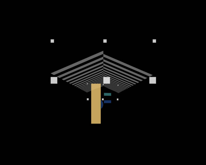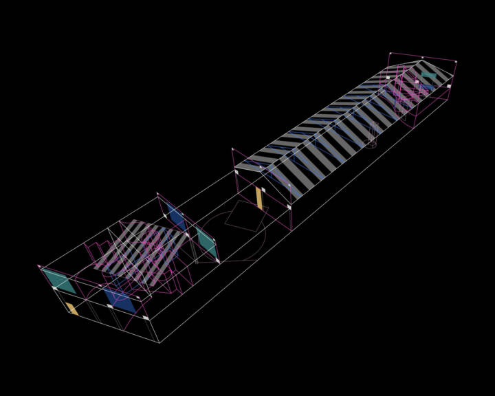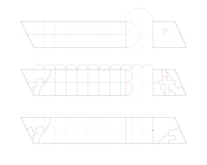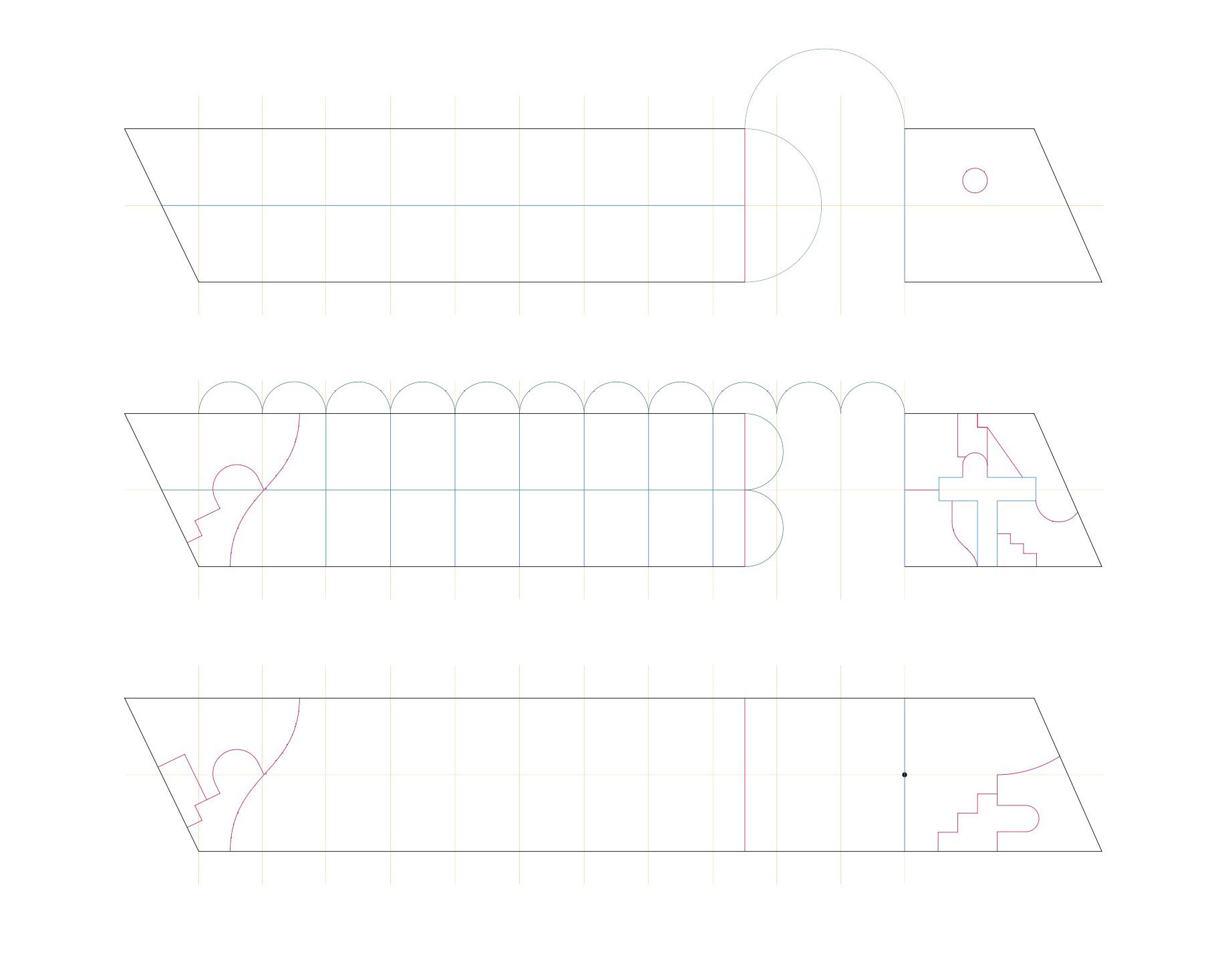 The five facets are addressed as a gang of elevations. each has a character of its own but they share apparent similarities. A grid of black dots attempts to make sense of the concrete structures and defines the figure of the facades.
