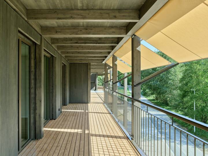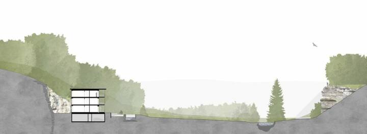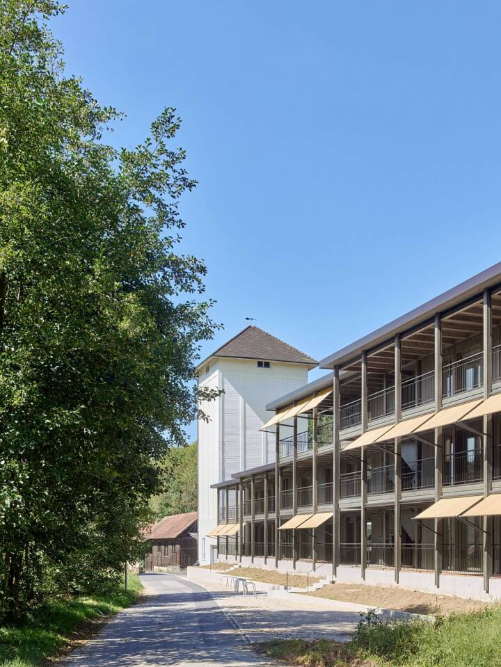 Alongside the natural rock formation on the northern side, the river, and the mill canal, several buildings protected as cantonal monuments define the area. Together they form an ensemble that is listed in the national inventory of heritage sites of importance. With its elongated overall form, the project continues the structure of this ensemble and extends the existing built fabric. Toward the rock face, the articulation of the volume gives it the flexibility to follow the natural line of the ground and to create a series of spatial sequences full of tension and rhythm.