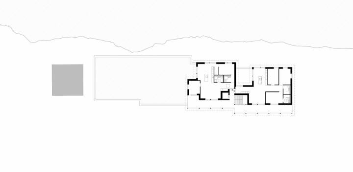To integrate optimally into the complementary surroundings of the sunny south and rocky north, the main living spaces extend transversely through the building volume. Their dual orientation allows the entire landscape chamber to be experienced. The continuous living space is offset in such a way that two interlocking living areas are created.