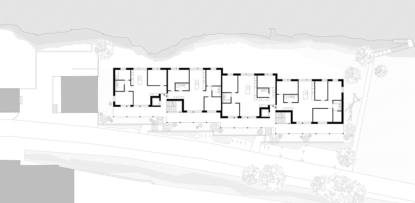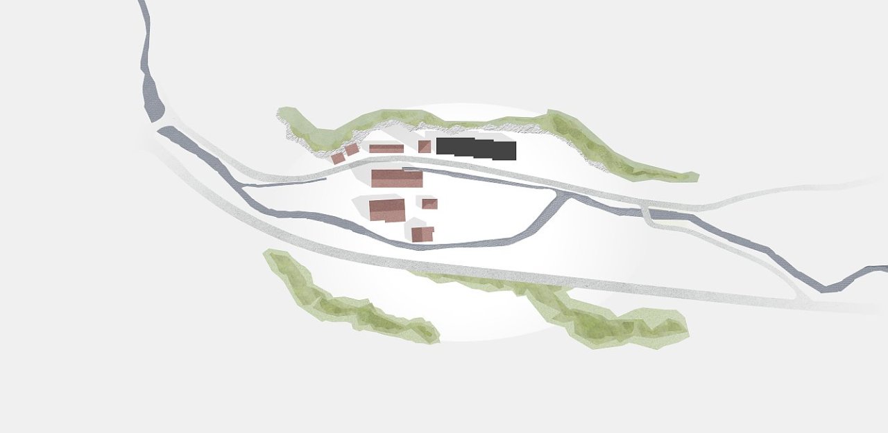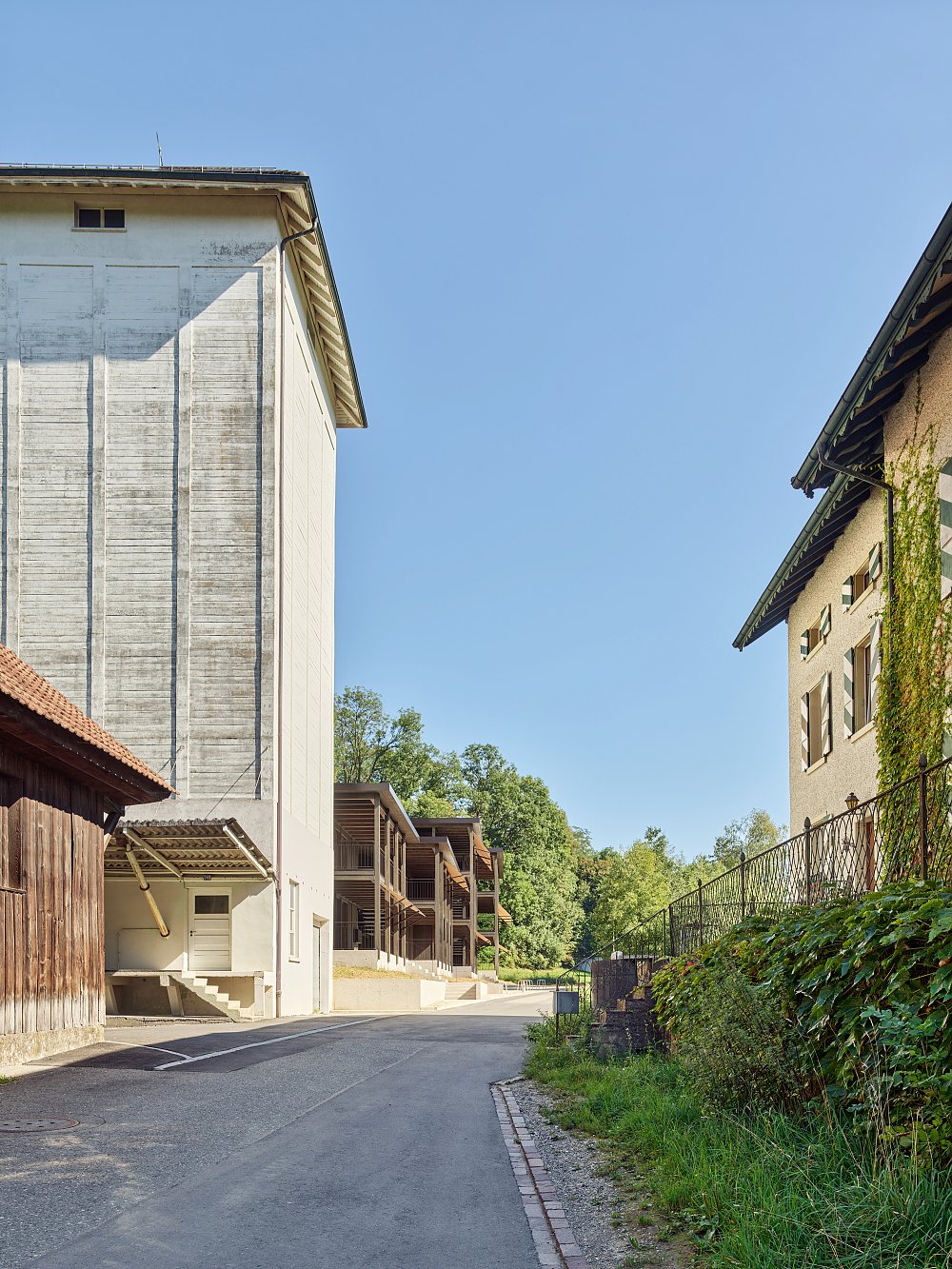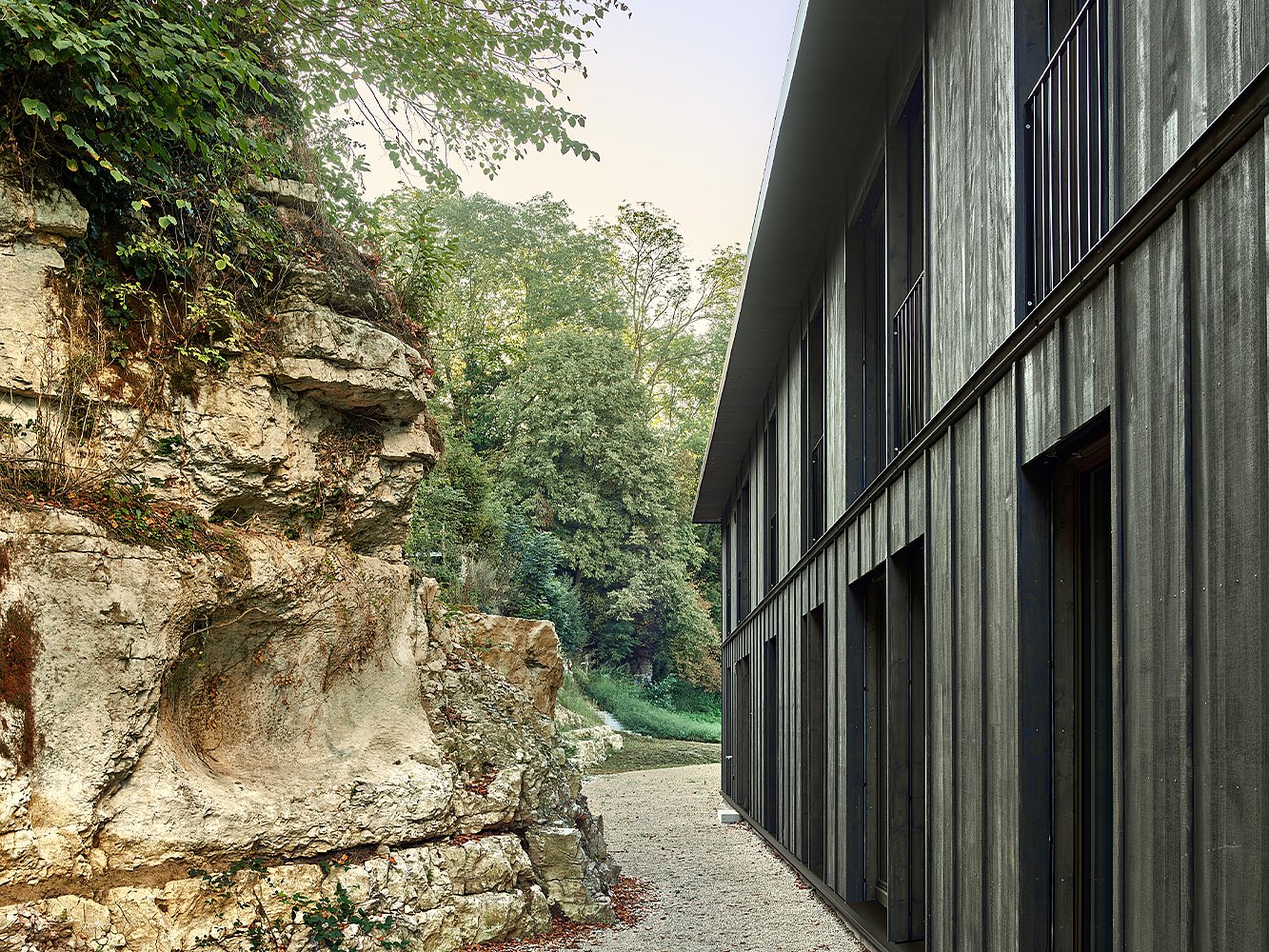 Alongside the natural rock formation on the northern side, the river, and the mill canal, several buildings protected as cantonal monuments define the area. Together they form an ensemble that is listed in the national inventory of heritage sites of importance. With its elongated overall form, the project continues the structure of this ensemble and extends the existing built fabric. Toward the rock face, the articulation of the volume gives it the flexibility to follow the natural line of the ground and to create a series of spatial sequences full of tension and rhythm.