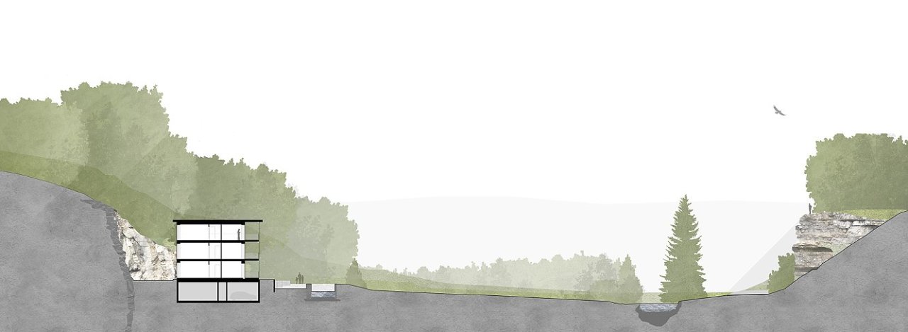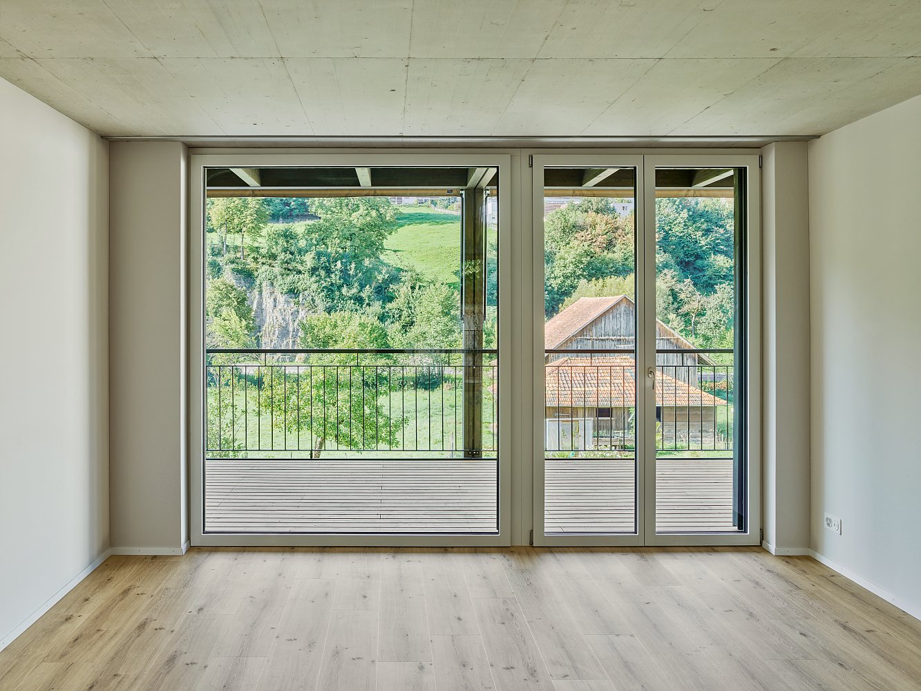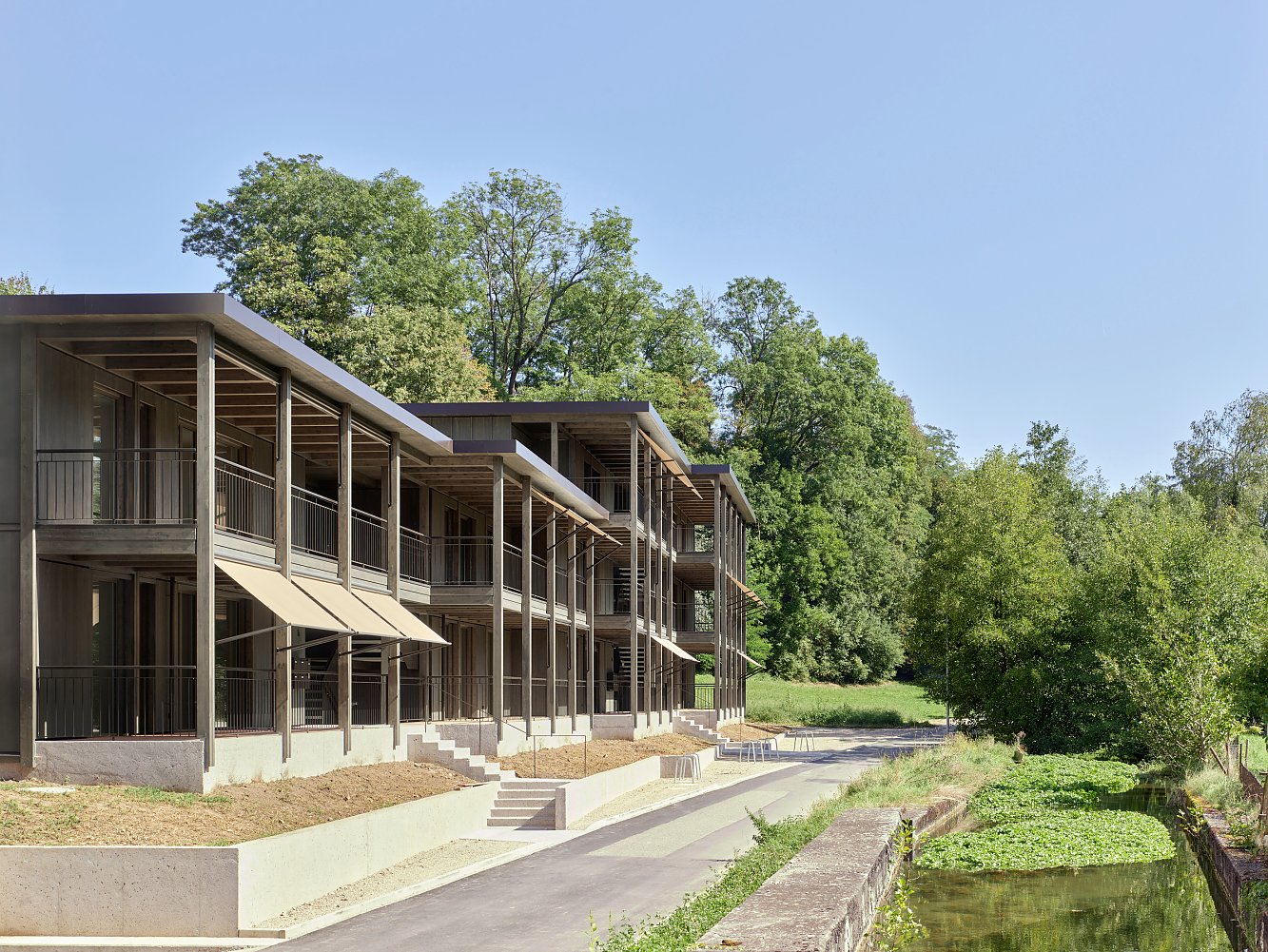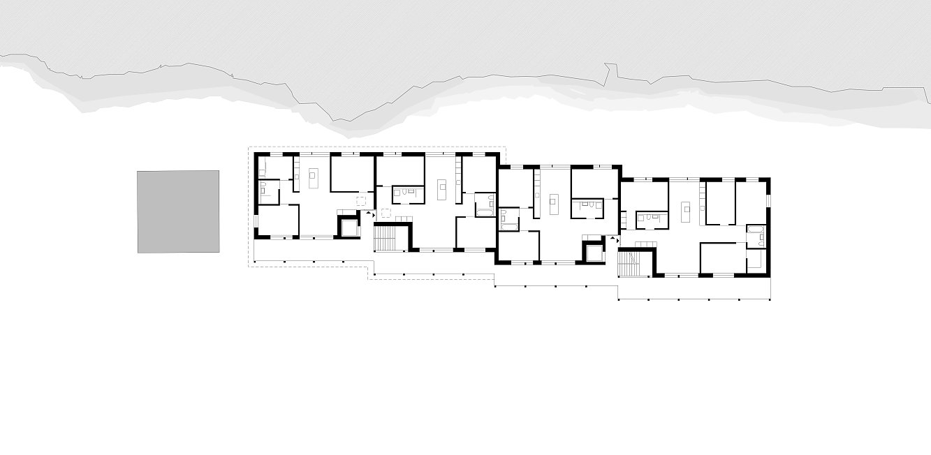 Alongside the natural rock formation on the northern side, the river, and the mill canal, several buildings protected as cantonal monuments define the area. Together they form an ensemble that is listed in the national inventory of heritage sites of importance. With its elongated overall form, the project continues the structure of this ensemble and extends the existing built fabric. Toward the rock face, the articulation of the volume gives it the flexibility to follow the natural line of the ground and to create a series of spatial sequences full of tension and rhythm.