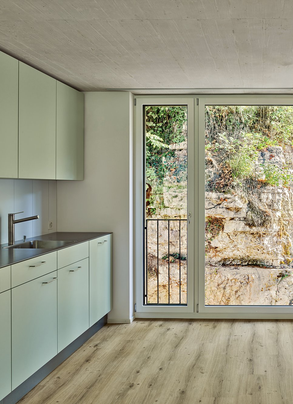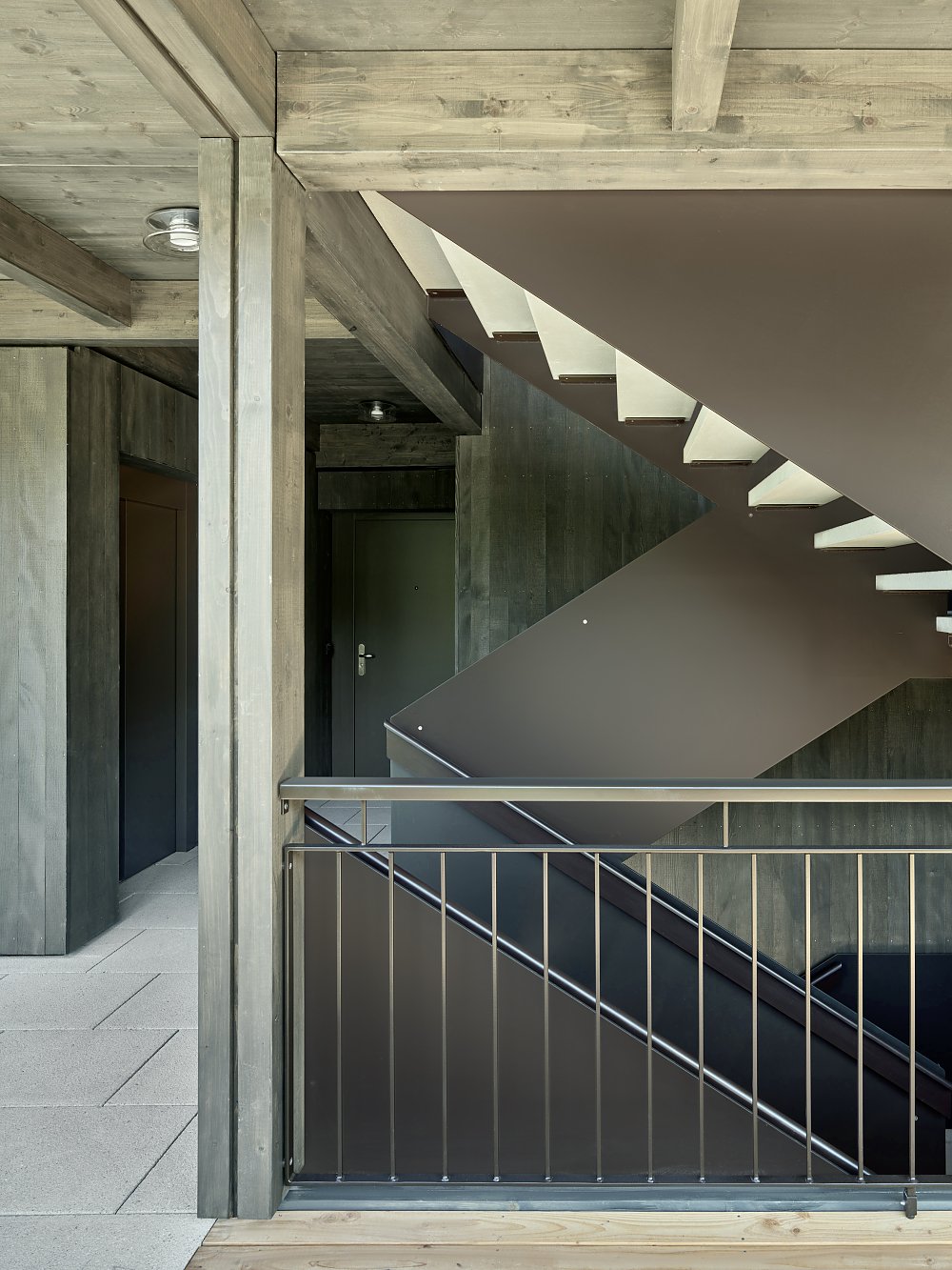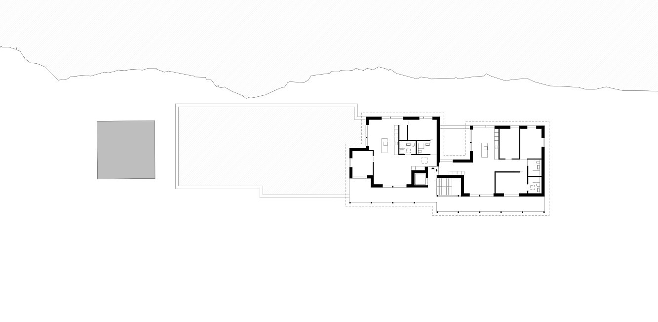 To integrate optimally into the complementary surroundings of the sunny south and rocky north, the main living spaces extend transversely through the building volume. Their dual orientation allows the entire landscape chamber to be experienced. The continuous living space is offset in such a way that two interlocking living areas are created.