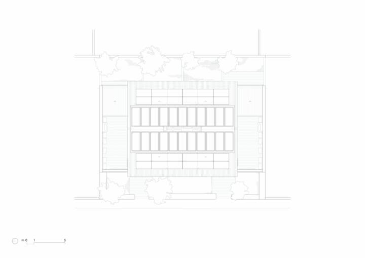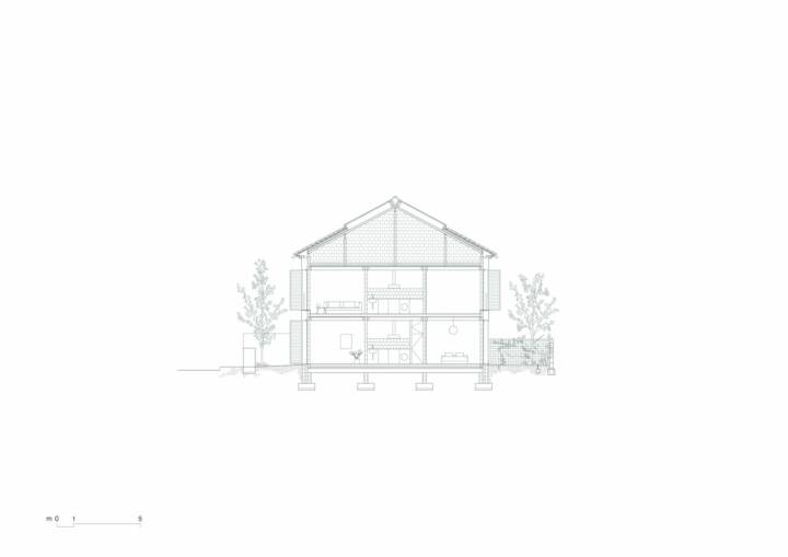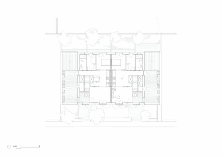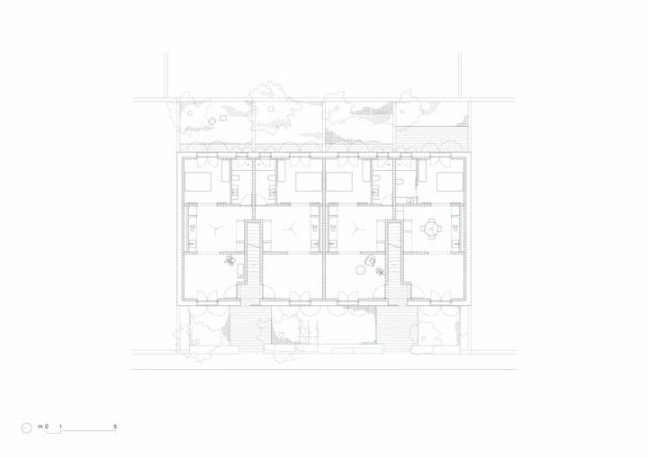 With two floors and a gable roof, the building is distributed into six dwellings, four on the lower ground floor and two on the upper level. The ground floor units have one bedroom and access to a private outdoor space, while the upper floor units have two bedrooms, each opening onto its own outdoor terrace. Open, flexible, and adaptable spaces are proposed that relate to each other directly, with the kitchen as the central space.