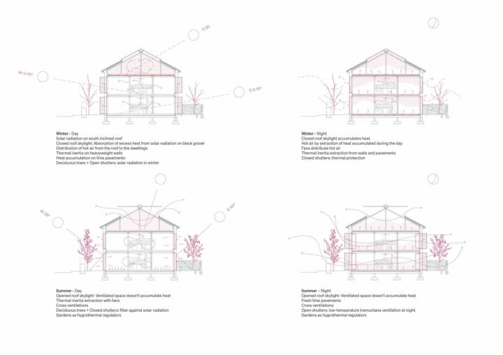 Read MoreCloseThe building is strategically designed to maximise solar gain in winter and reduce cooling demand in summer, incorporating cross ventilation, solar shading, and high thermal inertia in floors and walls with humidity-regulating hygroscopy and breathability. The ‘Trombe’ type roof is a key element that captures heat in winter and is ventilated in summer, regulating the temperature and thus eliminating active systems. The private patios function as user control and filtering elements for the ventilation of the dwellings.