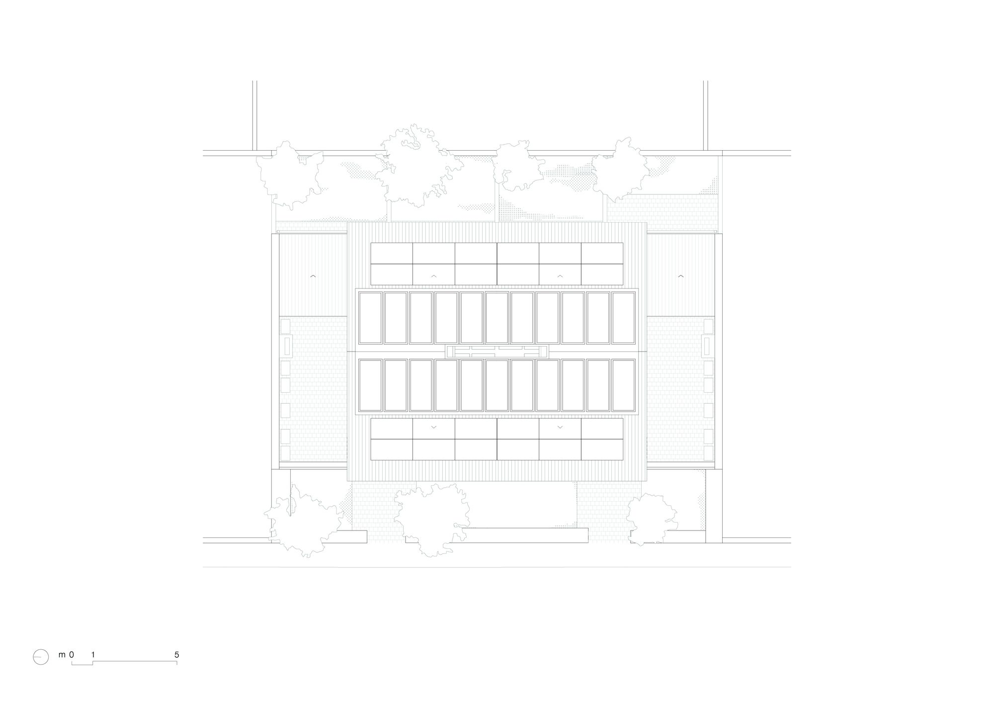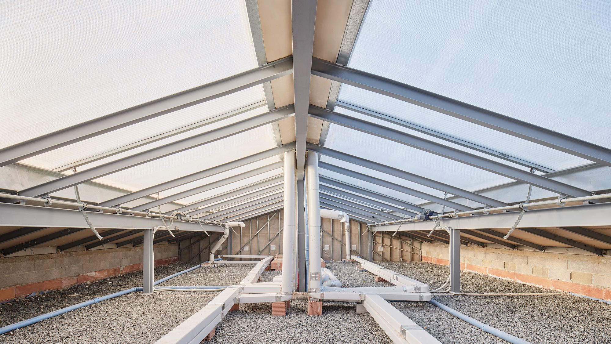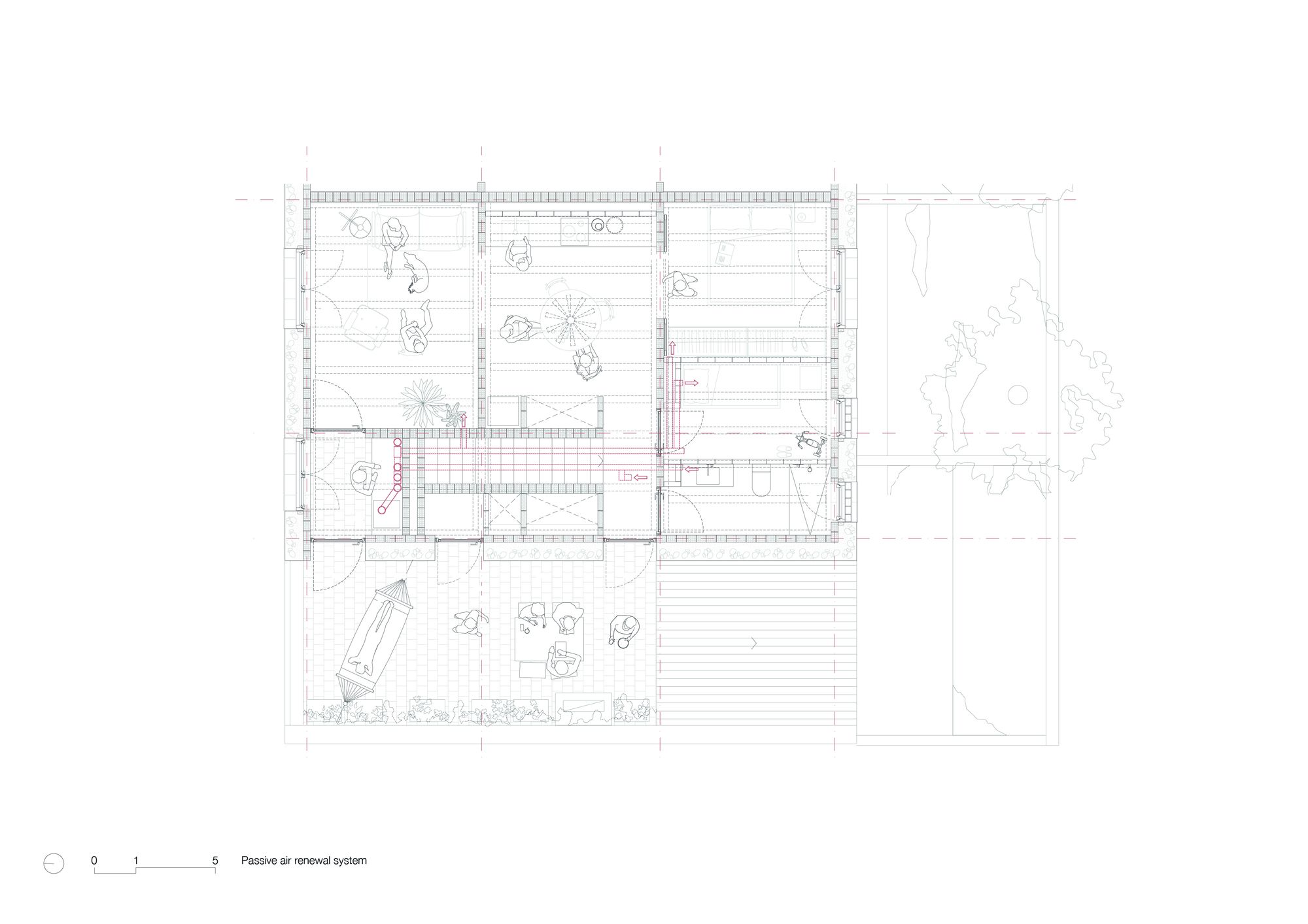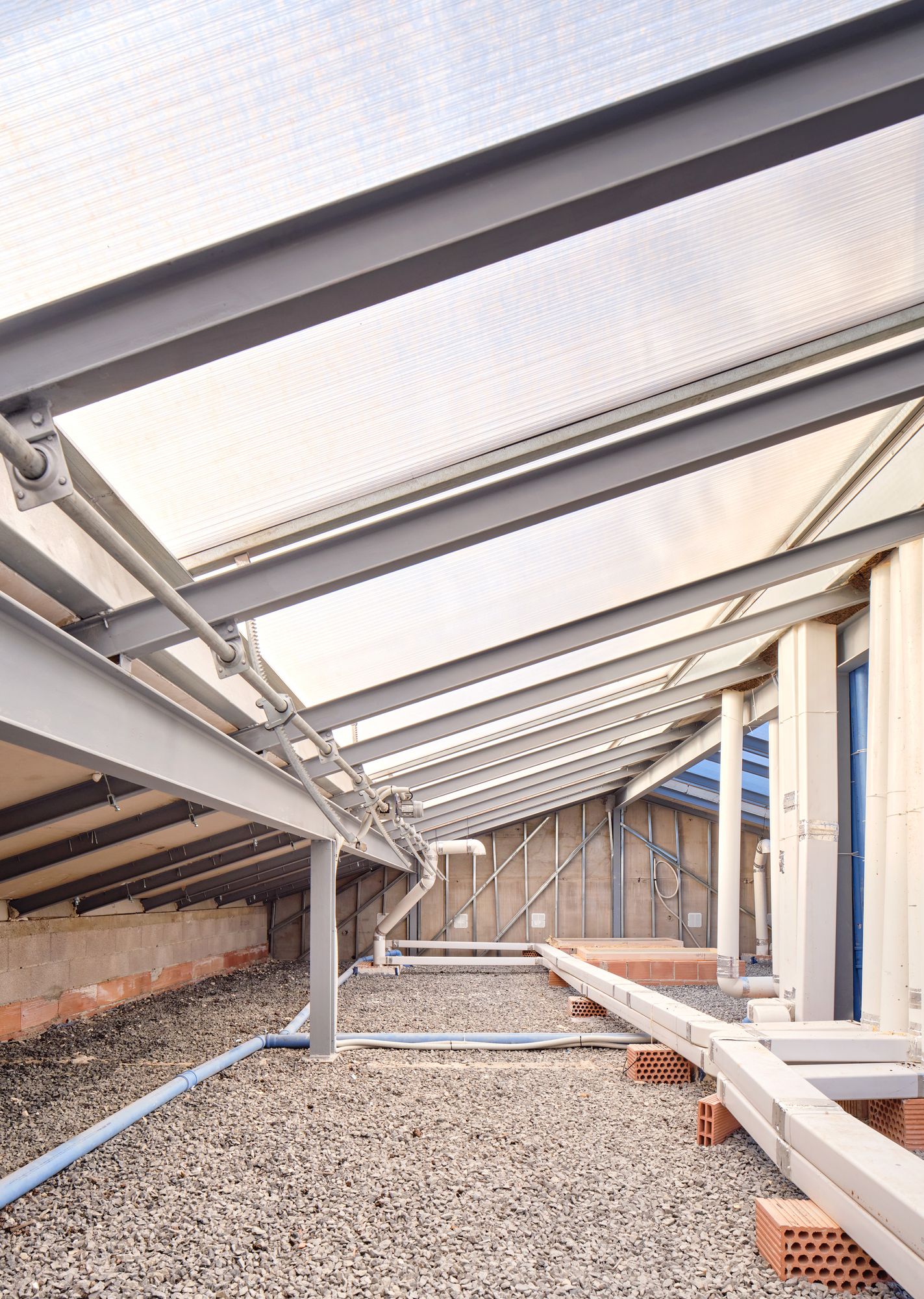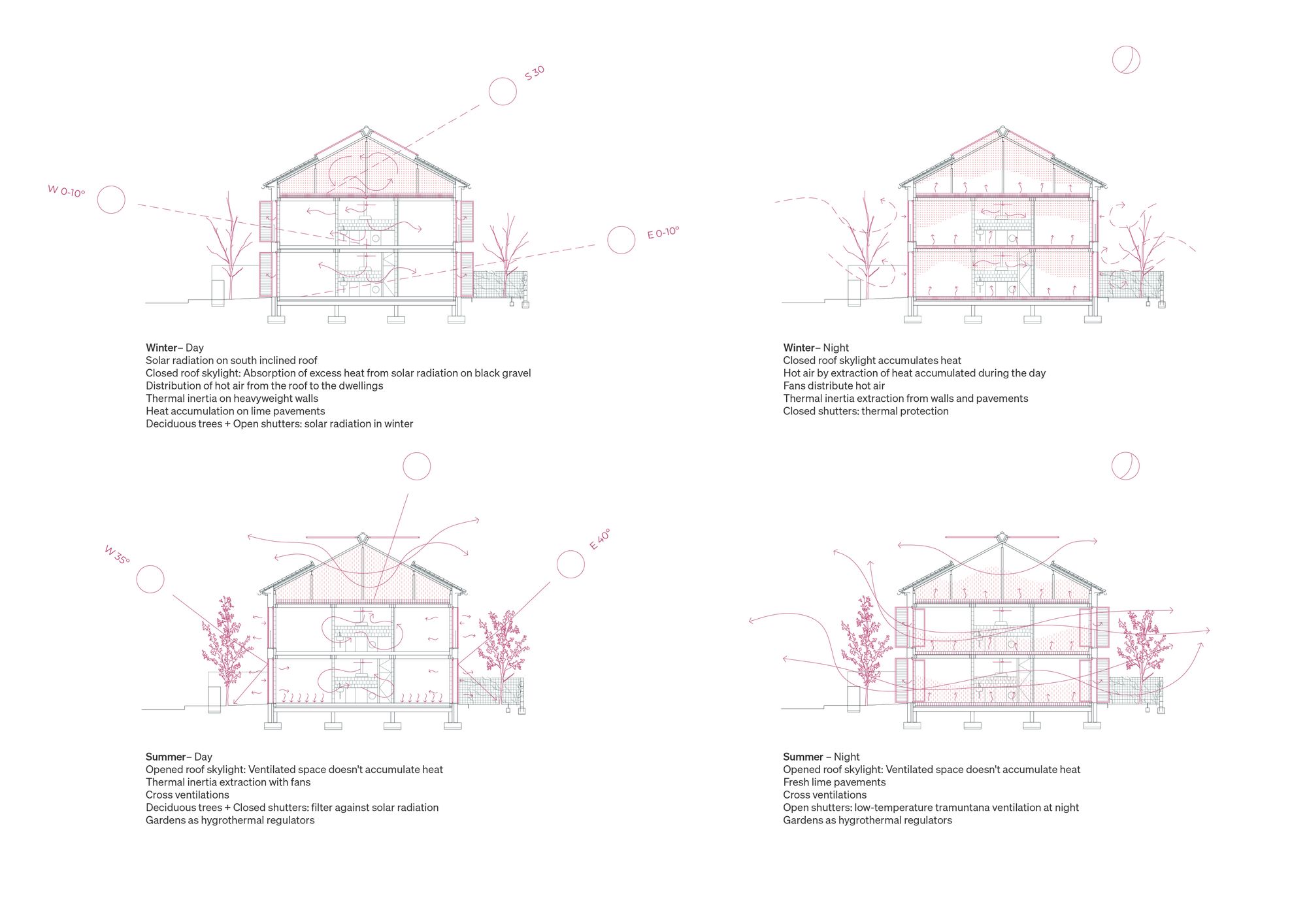 Read MoreCloseThe building is strategically designed to maximise solar gain in winter and reduce cooling demand in summer, incorporating cross ventilation, solar shading, and high thermal inertia in floors and walls with humidity-regulating hygroscopy and breathability. The ‘Trombe’ type roof is a key element that captures heat in winter and is ventilated in summer, regulating the temperature and thus eliminating active systems. The private patios function as user control and filtering elements for the ventilation of the dwellings.