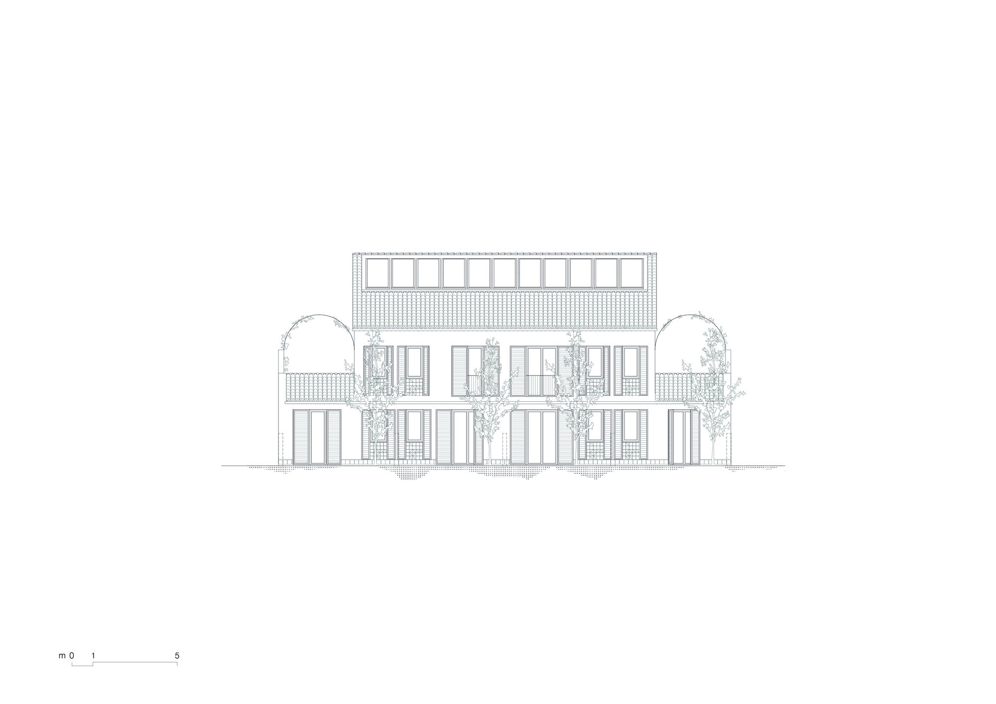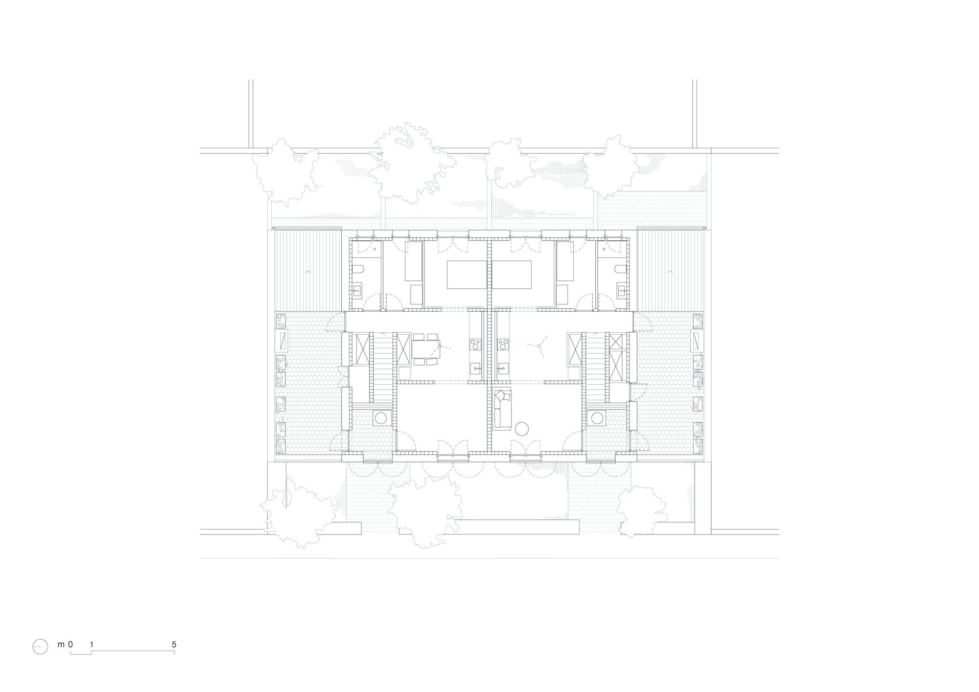 With two floors and a gable roof, the building is distributed into six dwellings, four on the lower ground floor and two on the upper level. The ground floor units have one bedroom and access to a private outdoor space, while the upper floor units have two bedrooms, each opening onto its own outdoor terrace. Open, flexible, and adaptable spaces are proposed that relate to each other directly, with the kitchen as the central space.