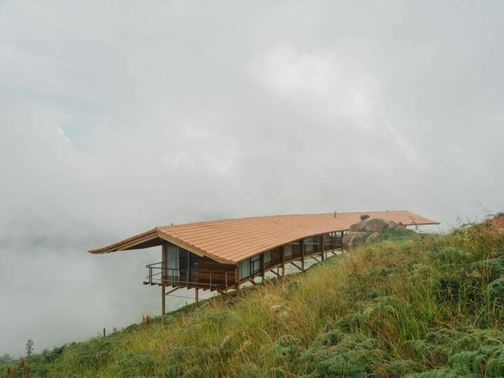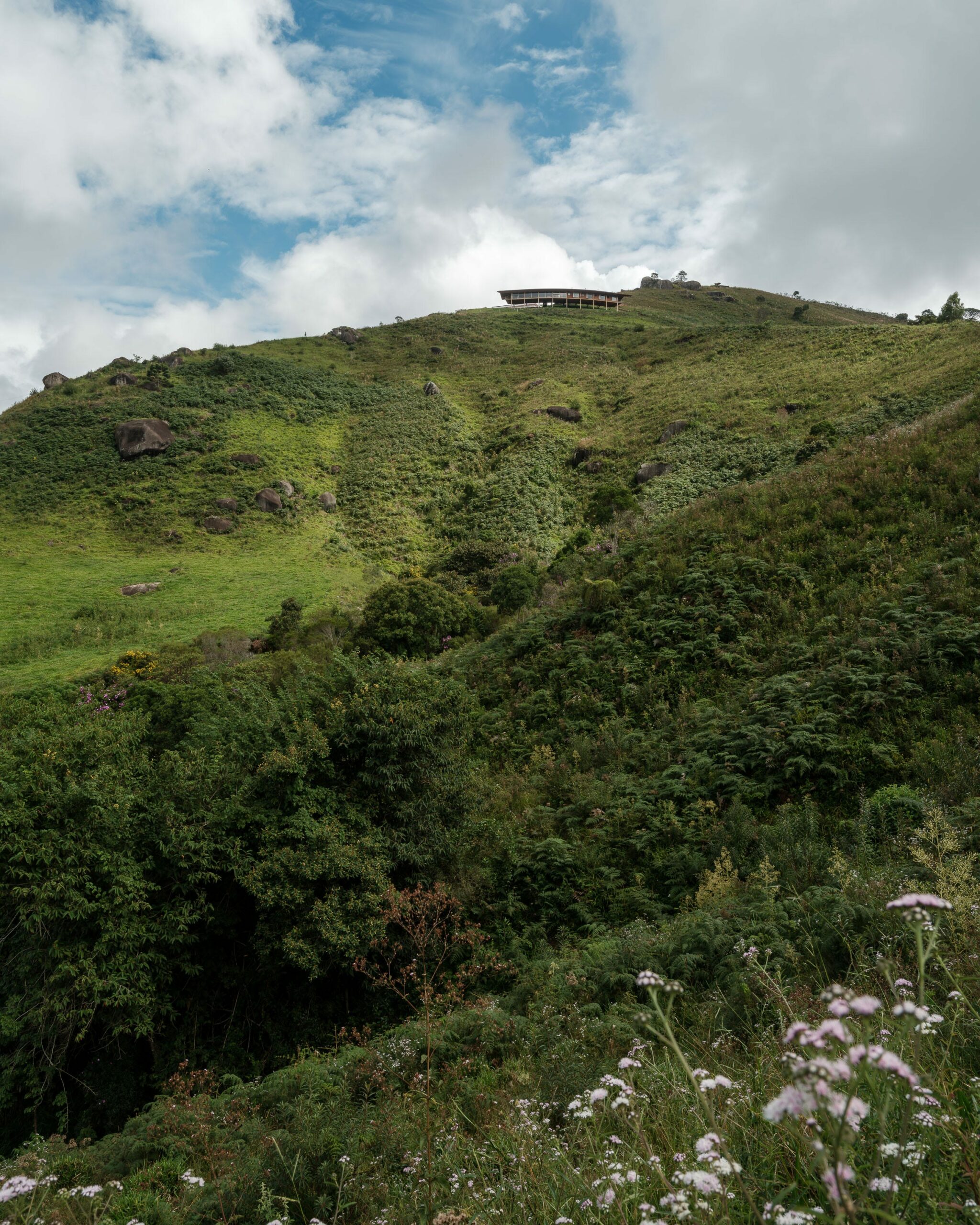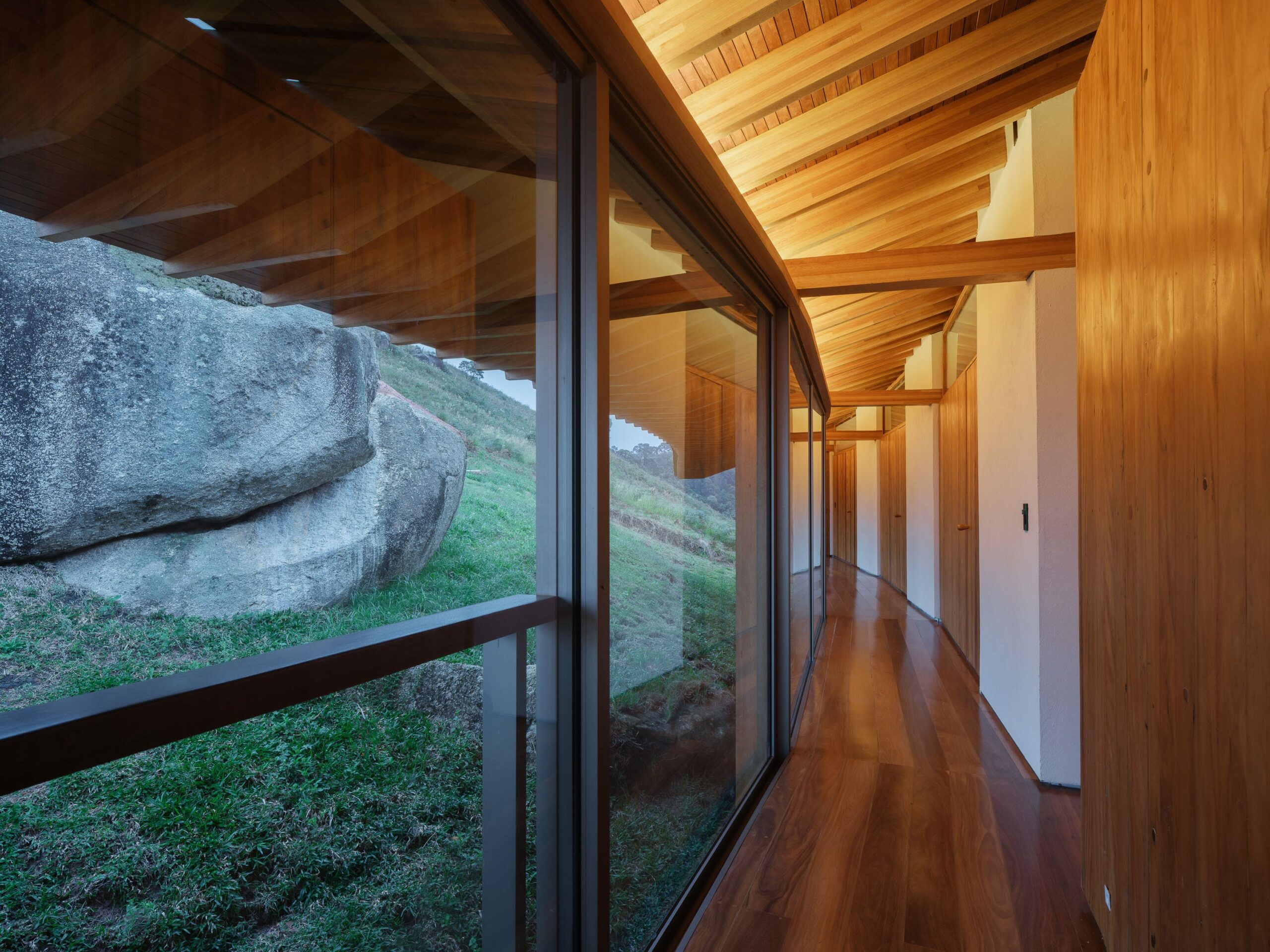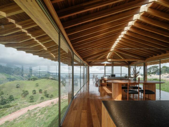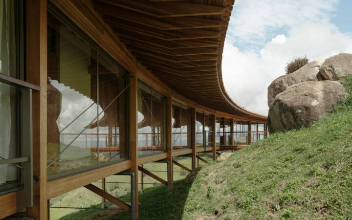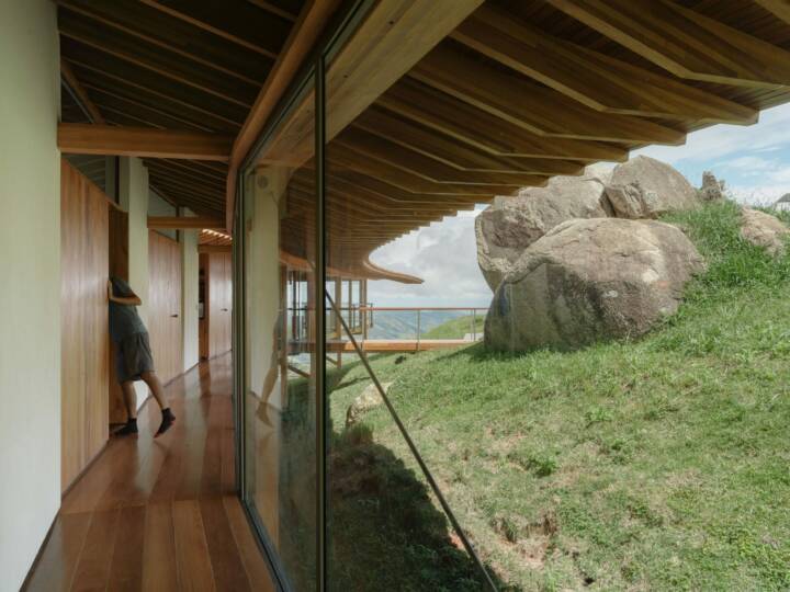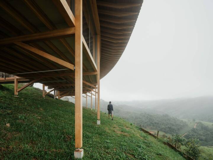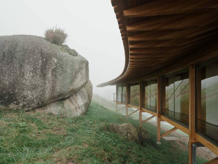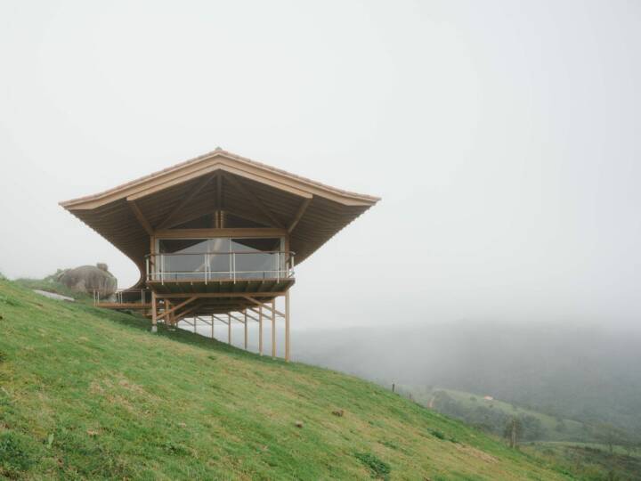 From this terrain, you can see the entire geography, the entire valley, and, in the distance, the next mountain, the Mantiqueira. Given this vastness, we decided to focus on a specific landscape, where we believe it makes sense to build a house. Amidst the sloping grassland, there’s a single tree, growing on a rock, which defines the house’s design.