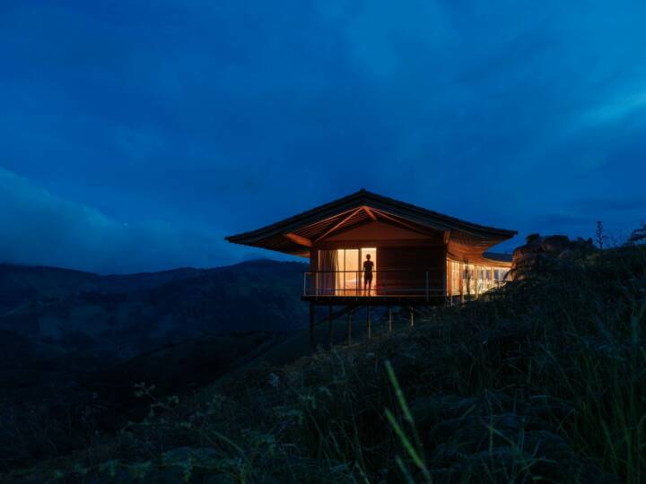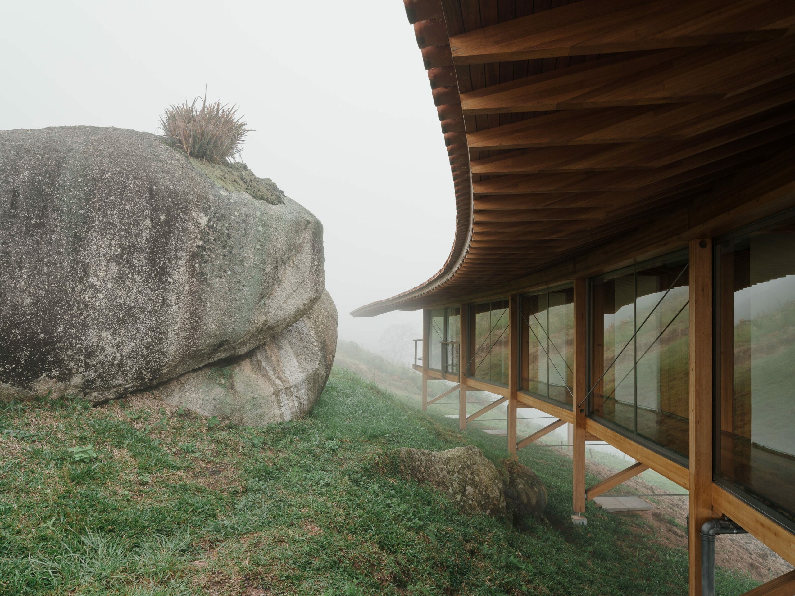 We sought to capture the essence of the site, while simultaneously introducing a high-tech wooden engineering project into the rural landscape. Seen from a distance, it qualifies as a work that tests the spatial and constructive potential of prefabricated wooden structures. Seen up close, the house is anchored to an existing rock with minimal disturbance to the site and recognizes its language in the local architecture of ceramic tile and wood huts.