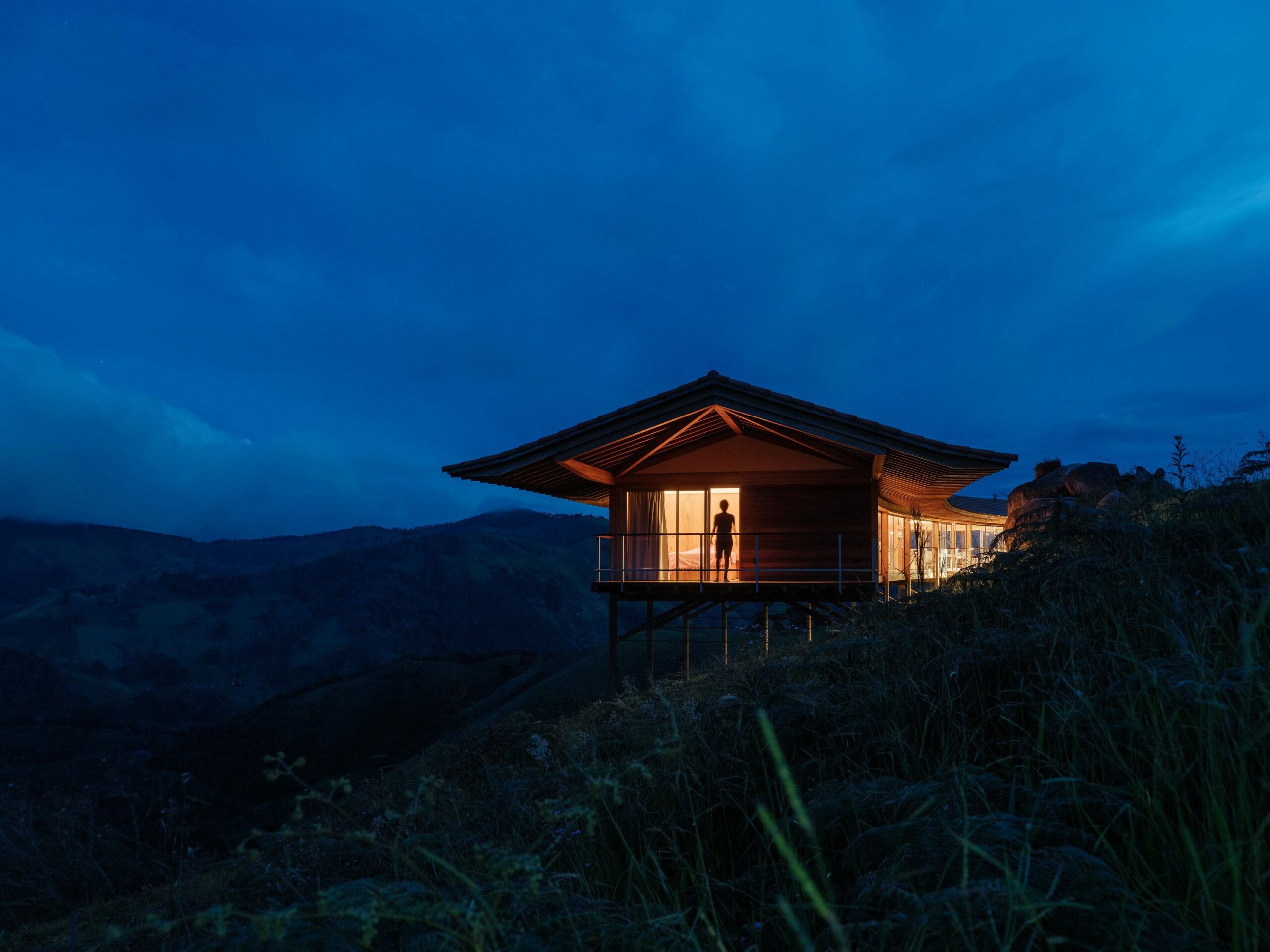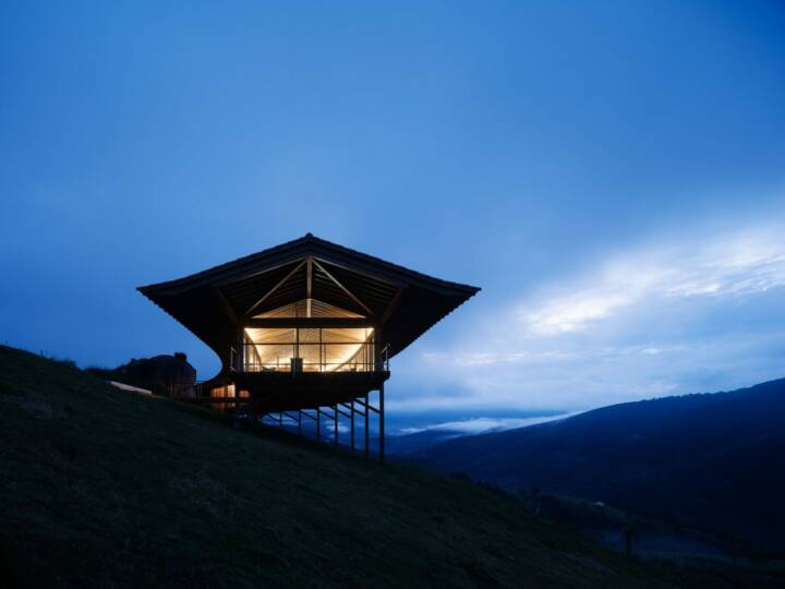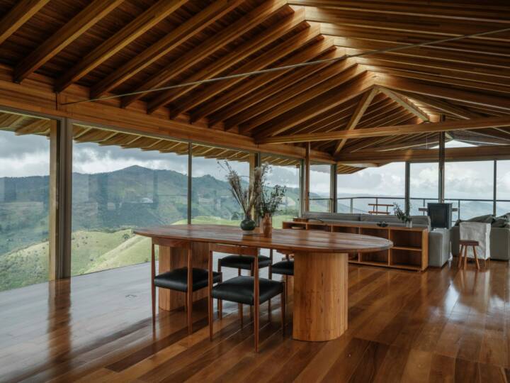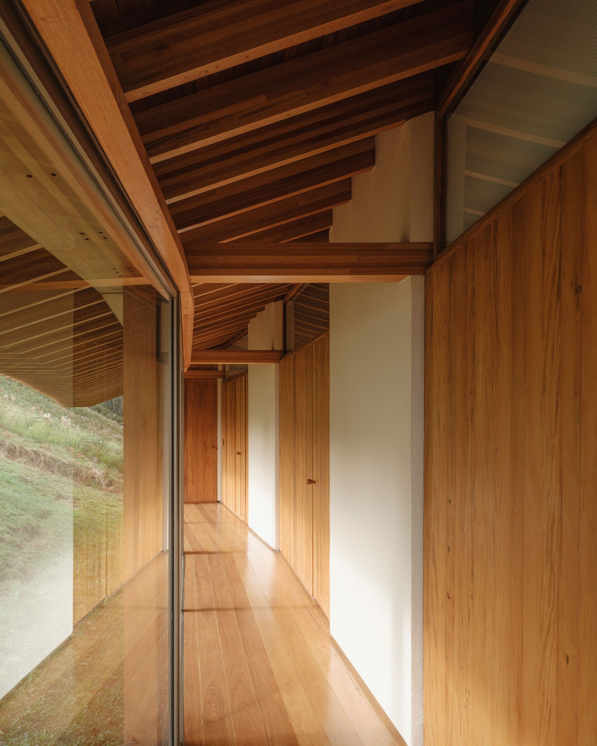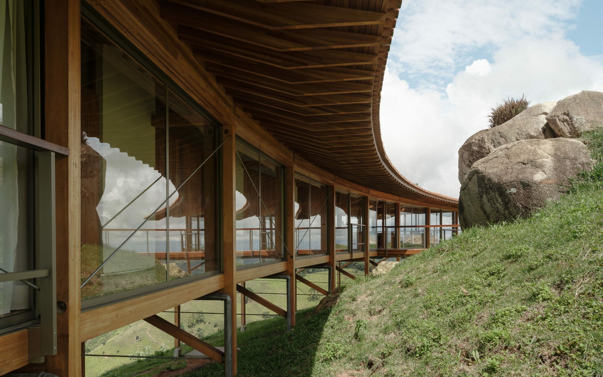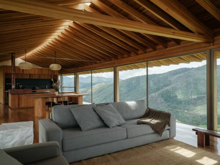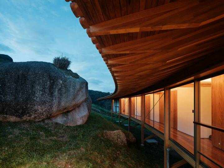 Less wood also means less material to be moved to the difficult-to-access terrain: the entire structure was produced in a controlled factory environment in collaboration with João Pini and the team at ITA Engenharia em Madeira, who were responsible for the structural design, fabrication and subsequent assembly on site by a team of specialized carpenters.