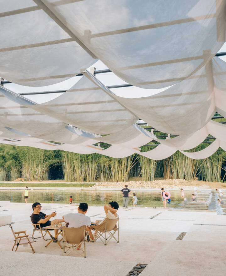 In the sweltering summer, the canopy is unfolded to welcome tourists; during typhoons or rainy days, it is retracted to ensure safety; in the off-seasons of autumn and winter, it is taken down to facilitate maintenance – and there is no need to apply for additional construction quotas. This flexible construction and operation logic takes from the site and gives back to the site. Next, let’s look at the ground landscape. After meeting the requirements of the river’s blue line setback and water conservancy elevation, we designed the ground projection area of the canopy as the starting point for accessing the stepping stones – an enlarged riverbank platform that acts like a “bridgehead”, accommodating crowds gathering and water-based activities.