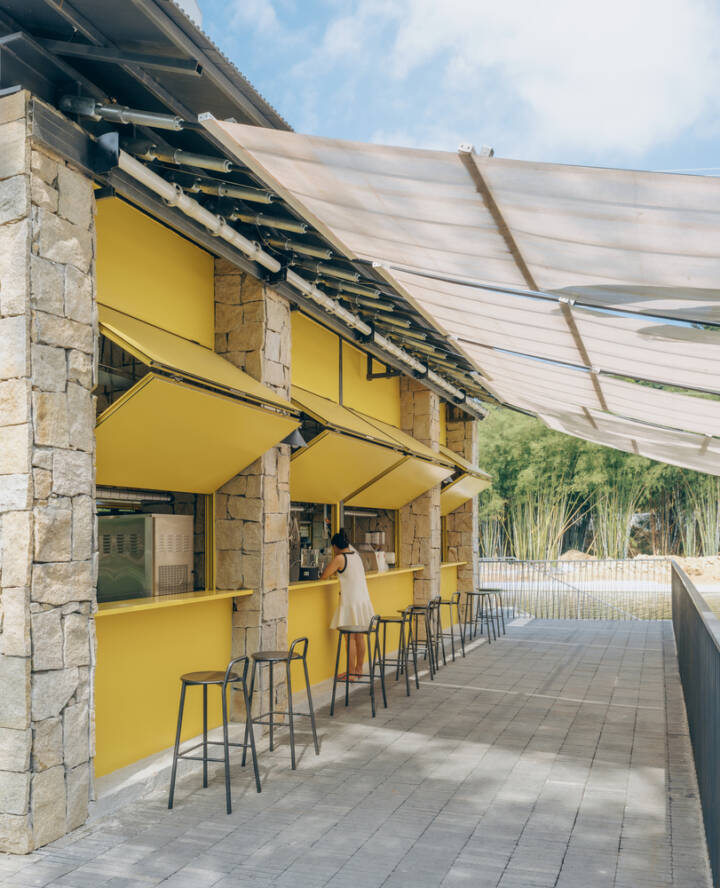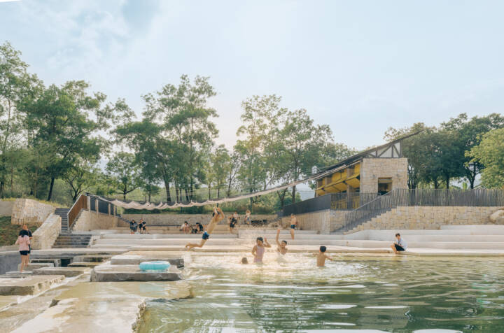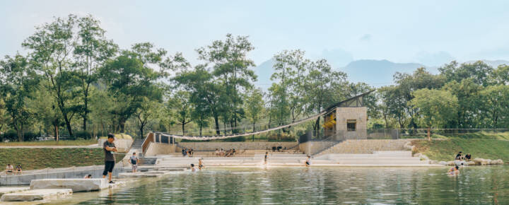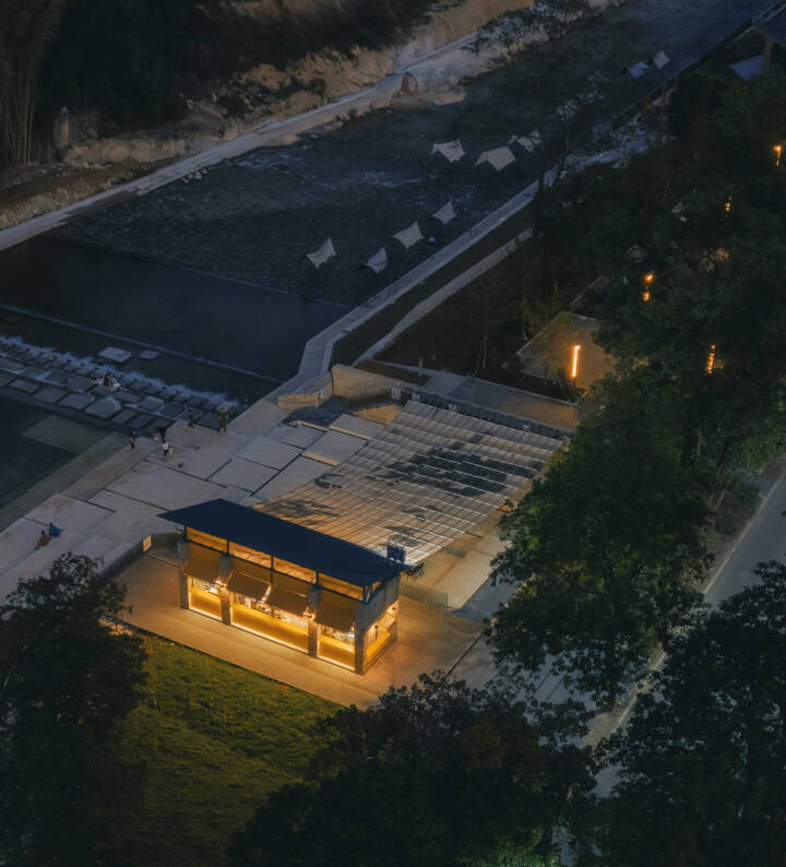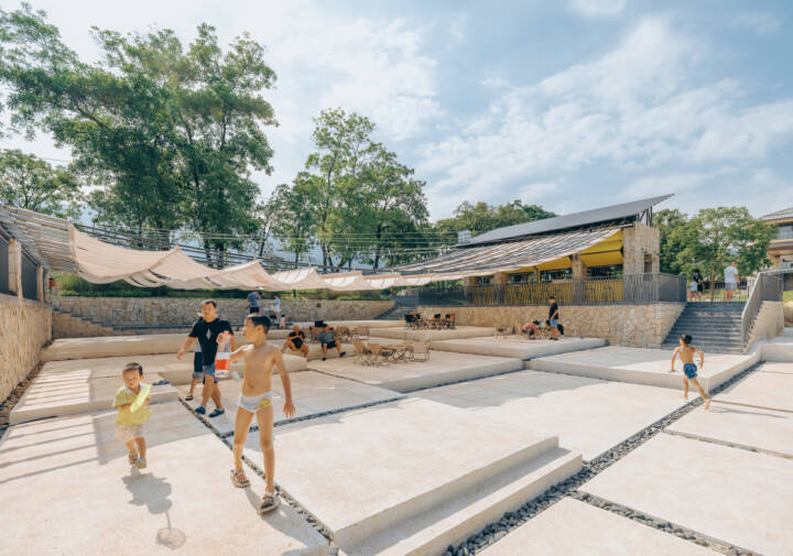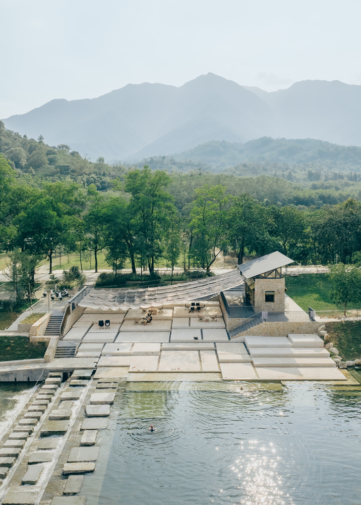 Sunshade, Stream Play and River Crossing — There was no need for excessive “groundless” planning; the site itself is alive, and it had already outlined the task at hand: Xialang is beautiful, and it would be even more beautiful with the addition of a canopy for shade, a few steps for easy access to the water, and a line of stepping stones for crossing the river. The operator of the future café on the site had no high requirements for the building area – the space could be accommodated within the footprint of the existing public toilet. This left the remaining outdoor area as the focus of our concept.