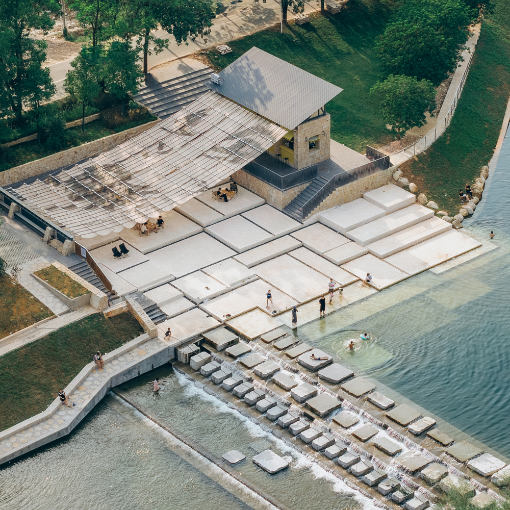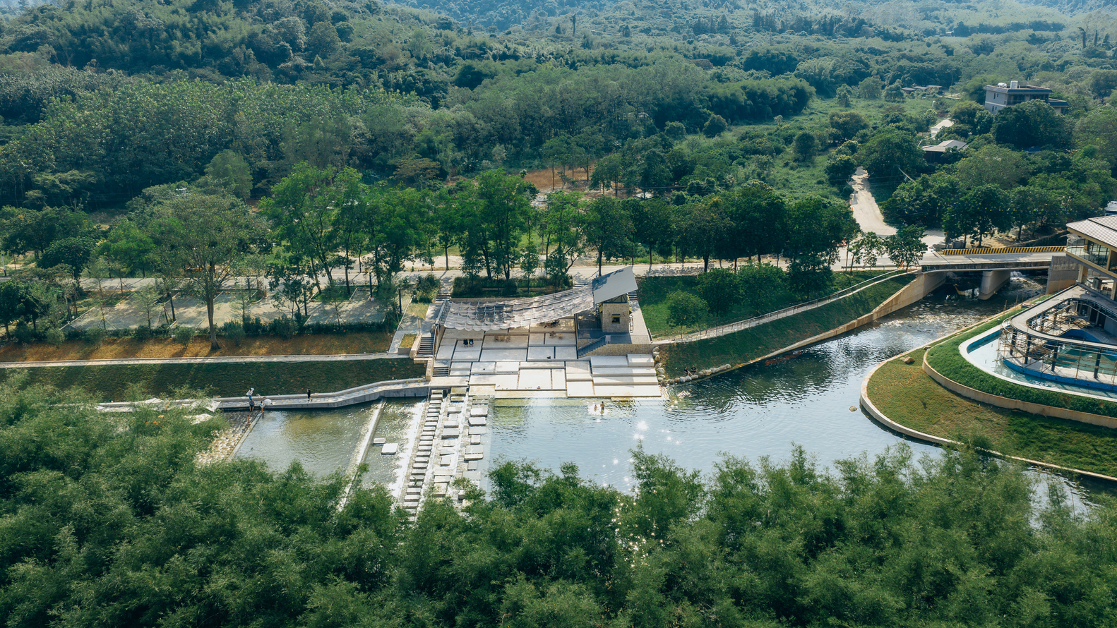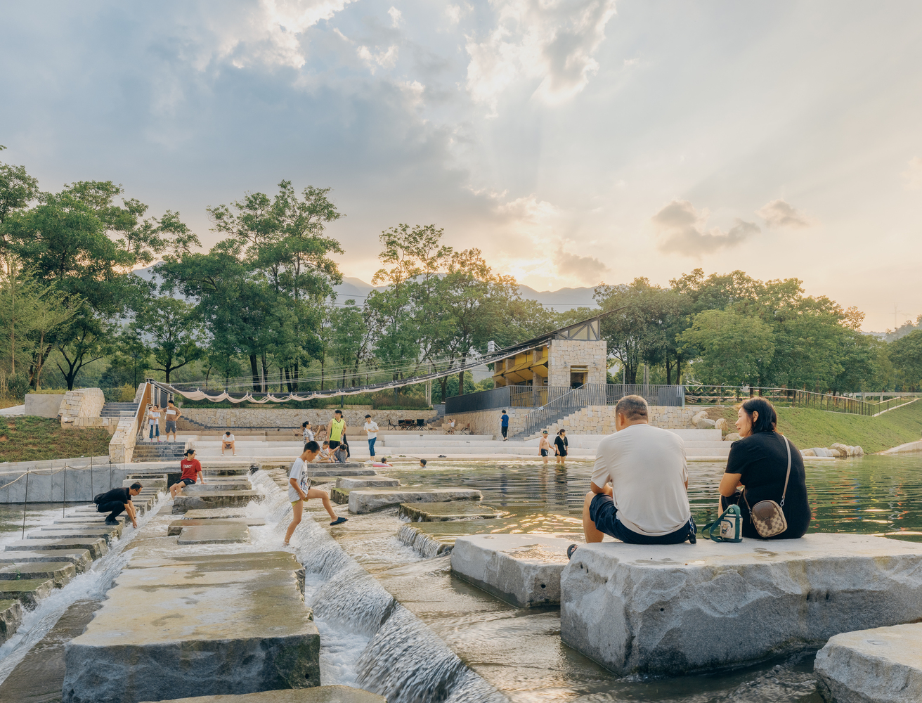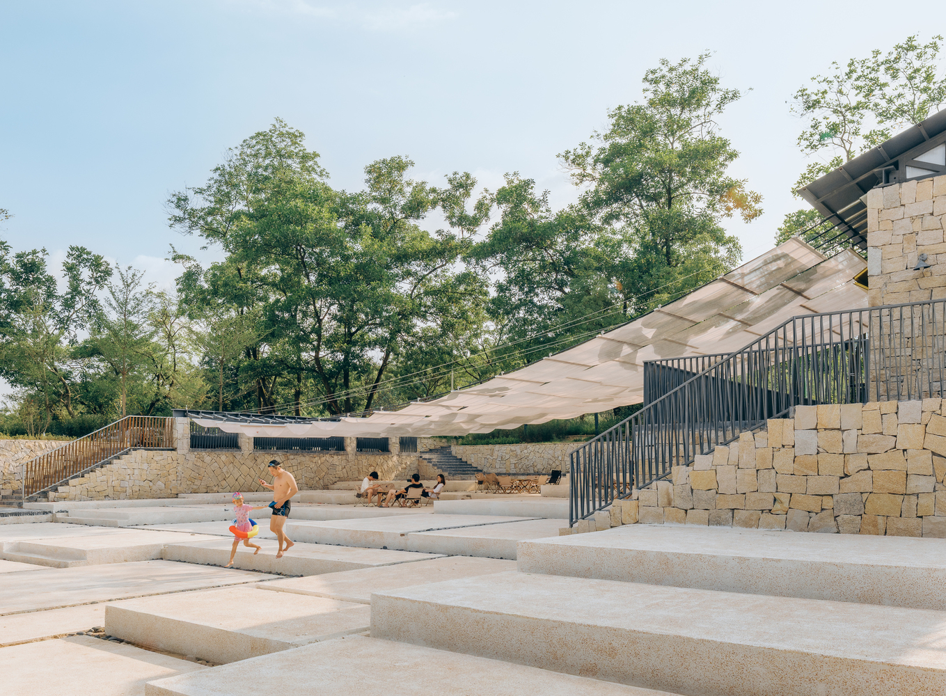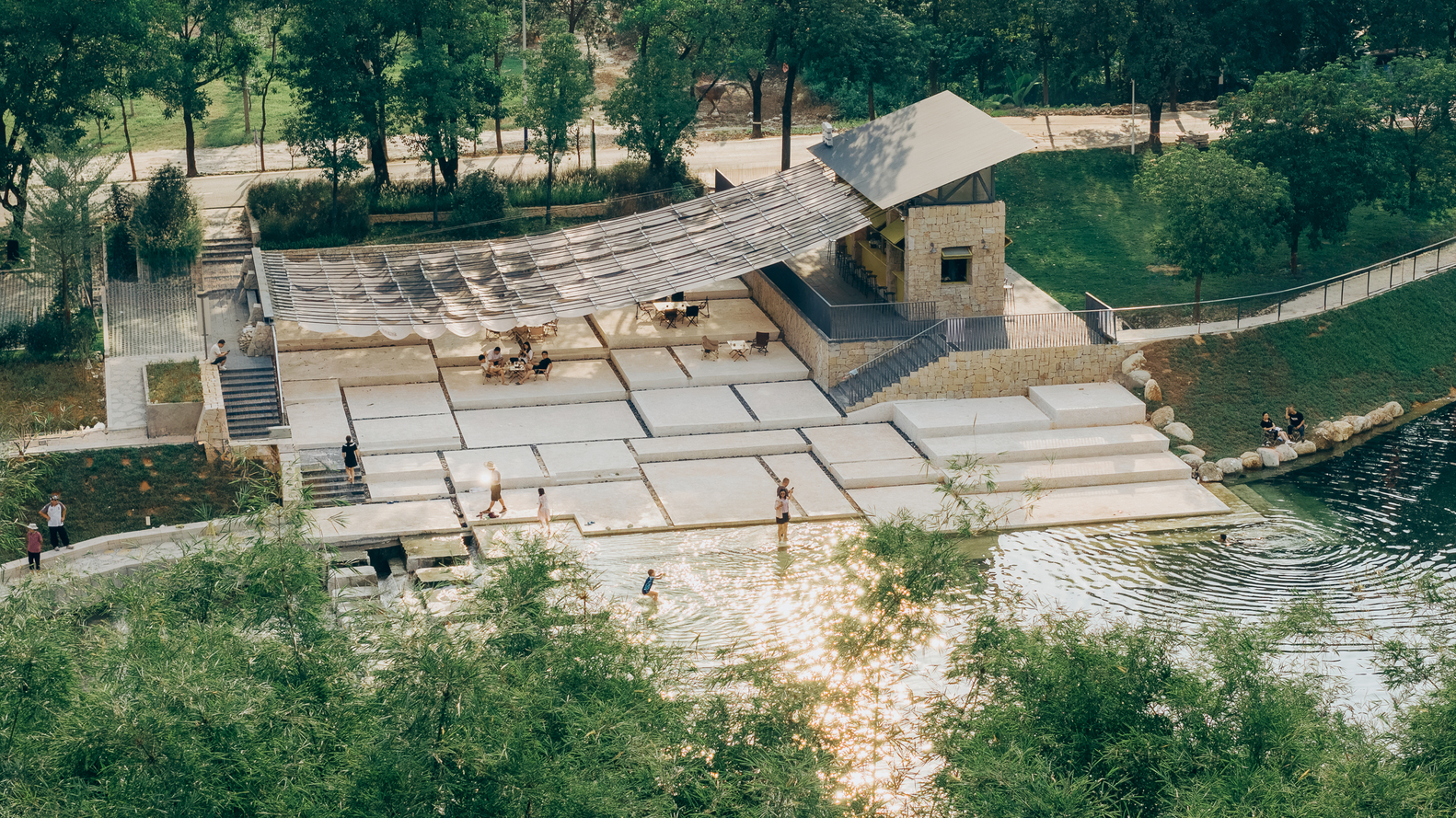 In the sweltering summer, the canopy is unfolded to welcome tourists; during typhoons or rainy days, it is retracted to ensure safety; in the off-seasons of autumn and winter, it is taken down to facilitate maintenance – and there is no need to apply for additional construction quotas. This flexible construction and operation logic takes from the site and gives back to the site. Next, let’s look at the ground landscape. After meeting the requirements of the river’s blue line setback and water conservancy elevation, we designed the ground projection area of the canopy as the starting point for accessing the stepping stones – an enlarged riverbank platform that acts like a “bridgehead”, accommodating crowds gathering and water-based activities.