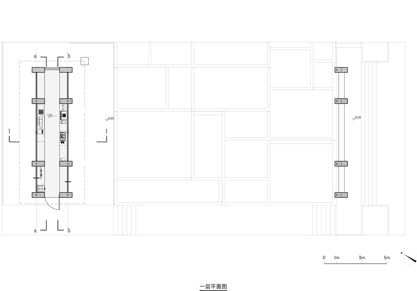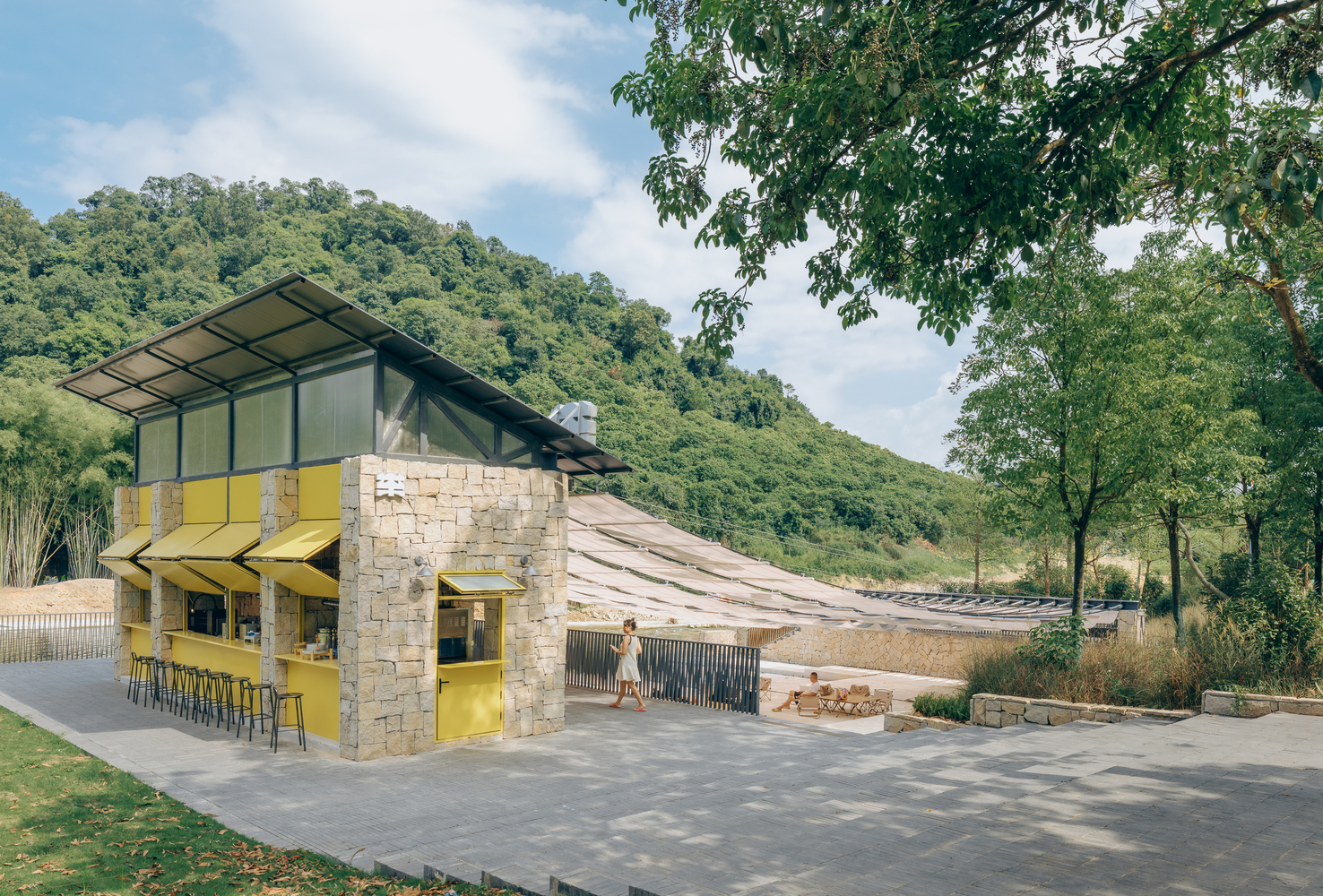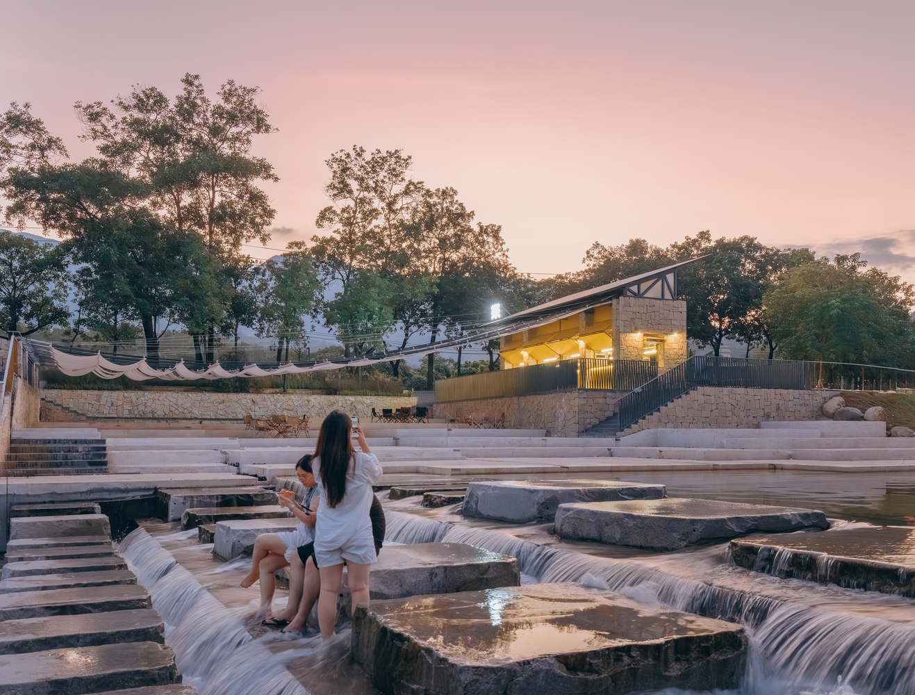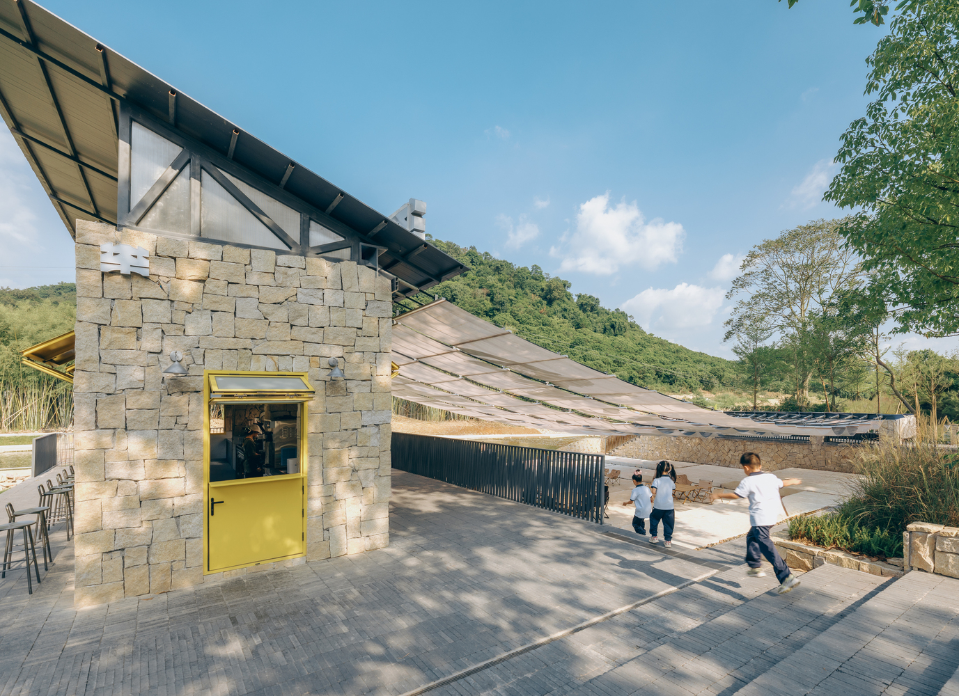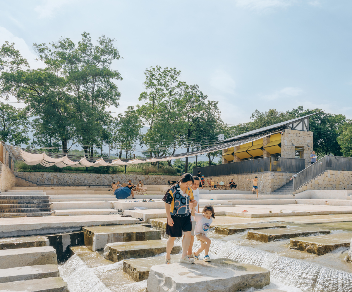 Sunshade, Stream Play and River Crossing — There was no need for excessive “groundless” planning; the site itself is alive, and it had already outlined the task at hand: Xialang is beautiful, and it would be even more beautiful with the addition of a canopy for shade, a few steps for easy access to the water, and a line of stepping stones for crossing the river. The operator of the future café on the site had no high requirements for the building area – the space could be accommodated within the footprint of the existing public toilet. This left the remaining outdoor area as the focus of our concept.