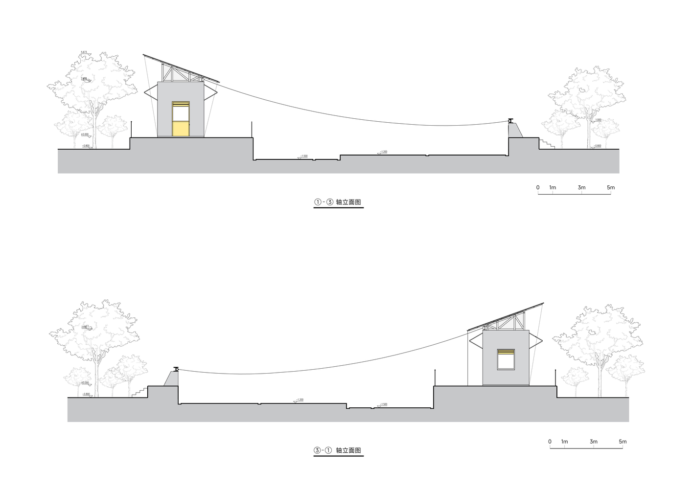 First, let’s look at the canopy. Pebbles serve as the structural foundation for the canopies rented out by the villagers. For the “The Grand Canopy”, we decided to use the main structure of the toilet: four partition walls were built to enclose 8 structural columns, forming the higher foundation on one side of the canopy. On the side of the existing dam, four corresponding low piers were built to form the foundation on the other side. Cables were strung between these two foundations – one high, one low, one north, one south – to complete the structural construction of the canopy.