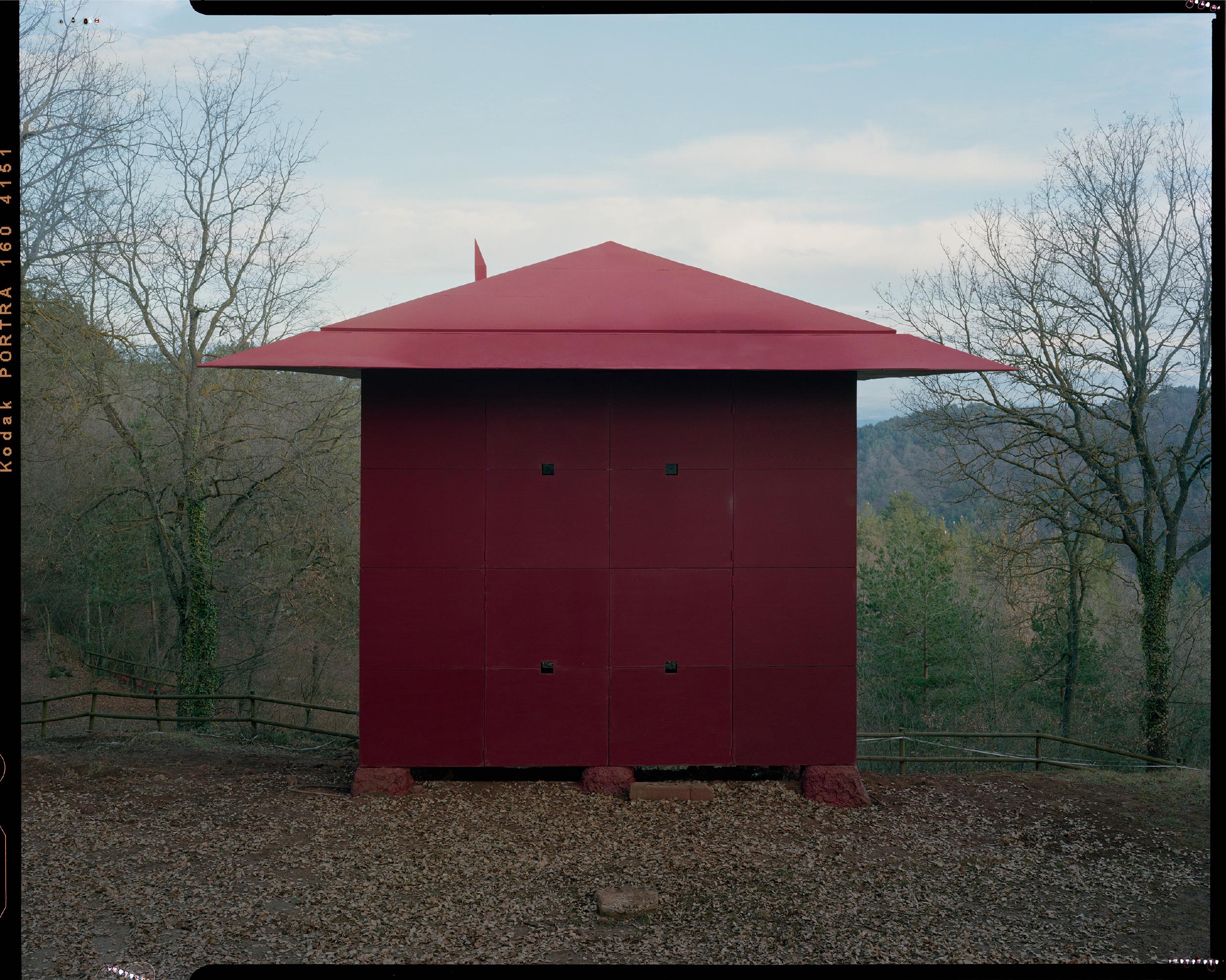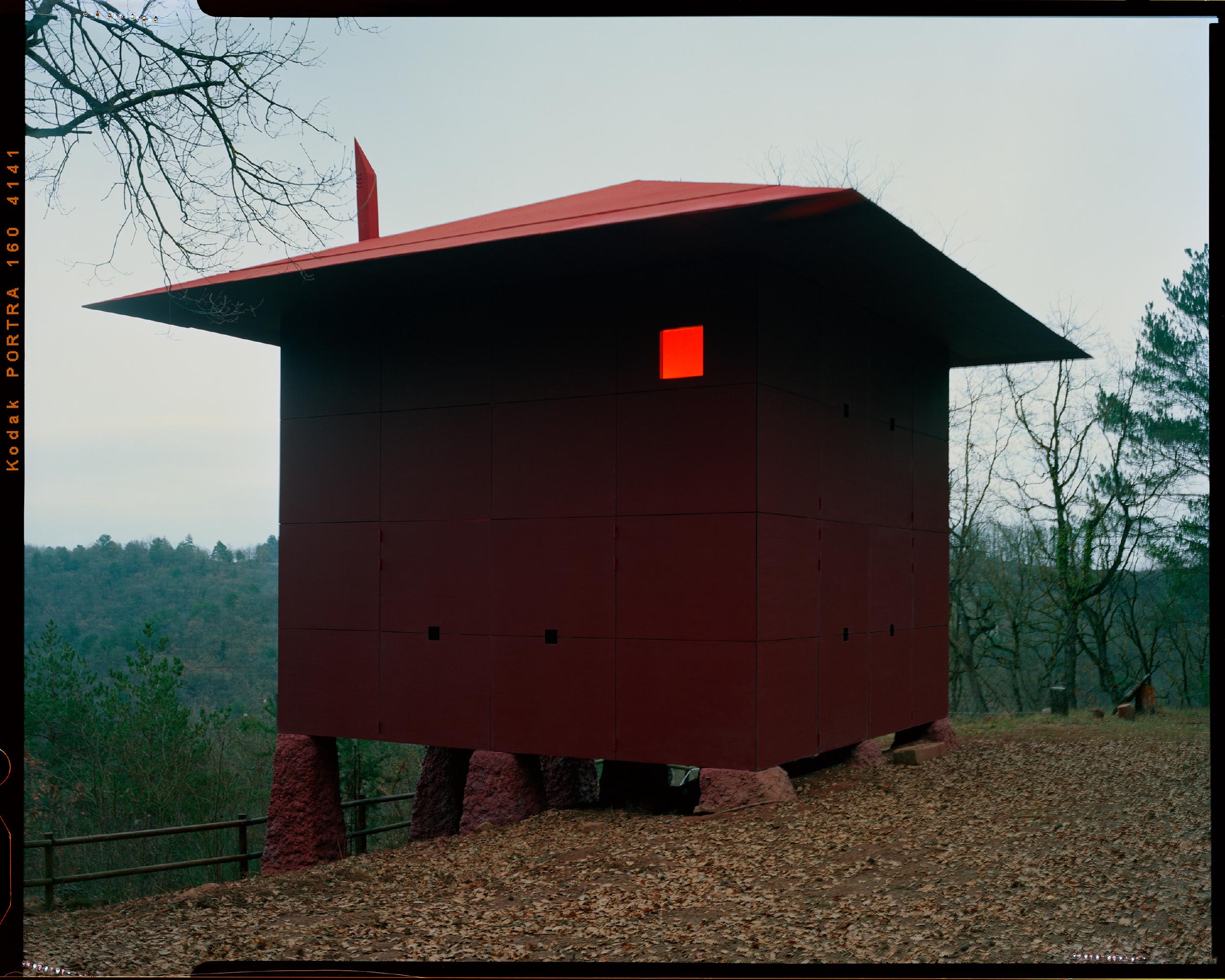 This house consists of 8 balloon-framed modules, each approximately 3x3x3 meters, clad with wood-textured panels, stacked on reinforced shotcrete pillars and joined with mechanical fasteners.