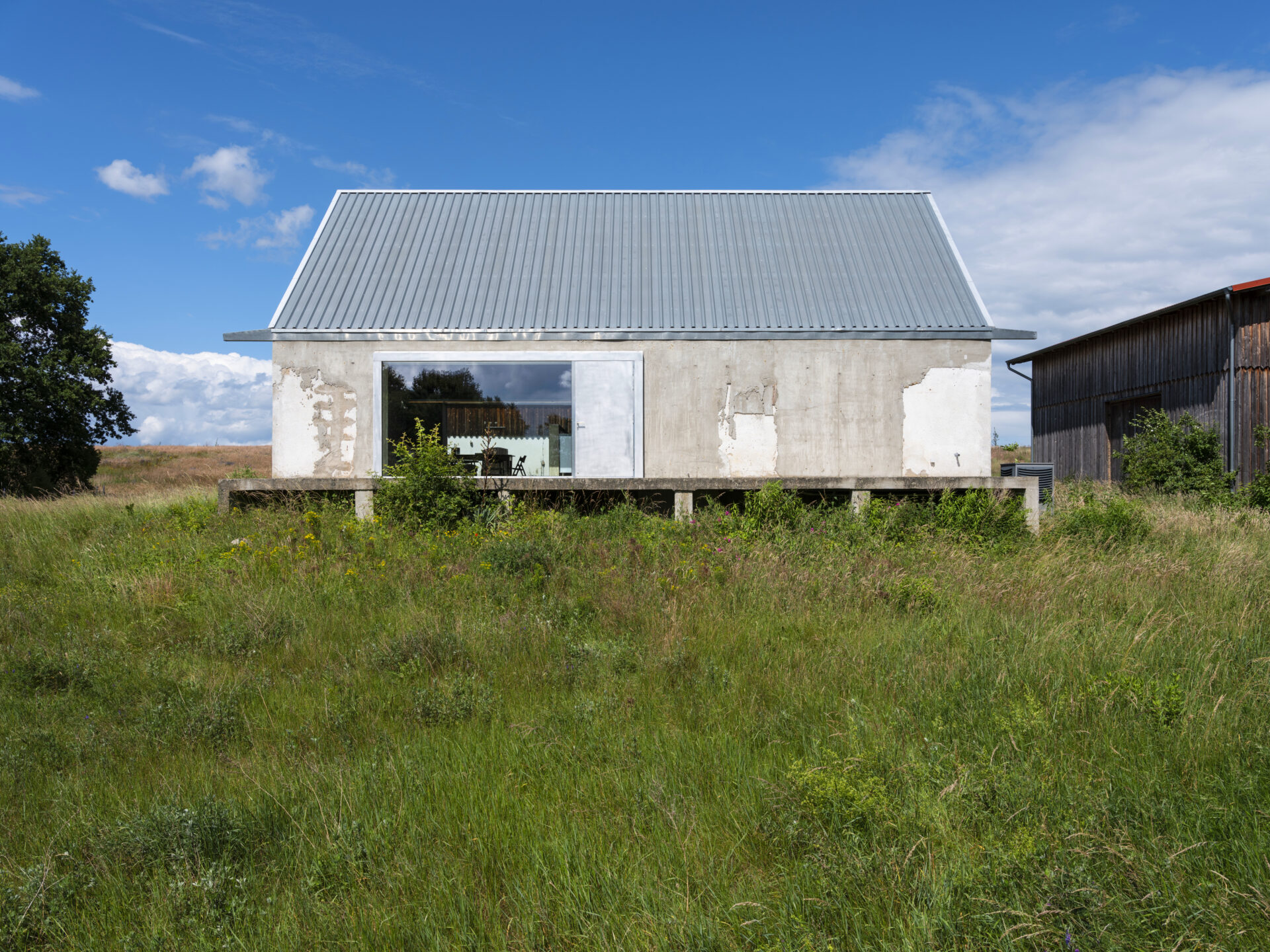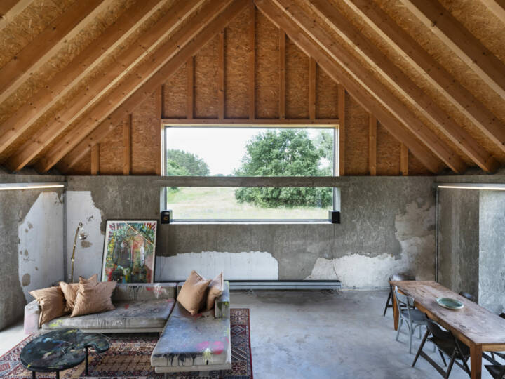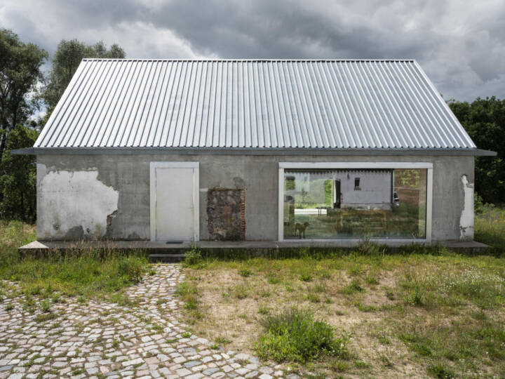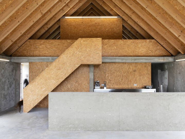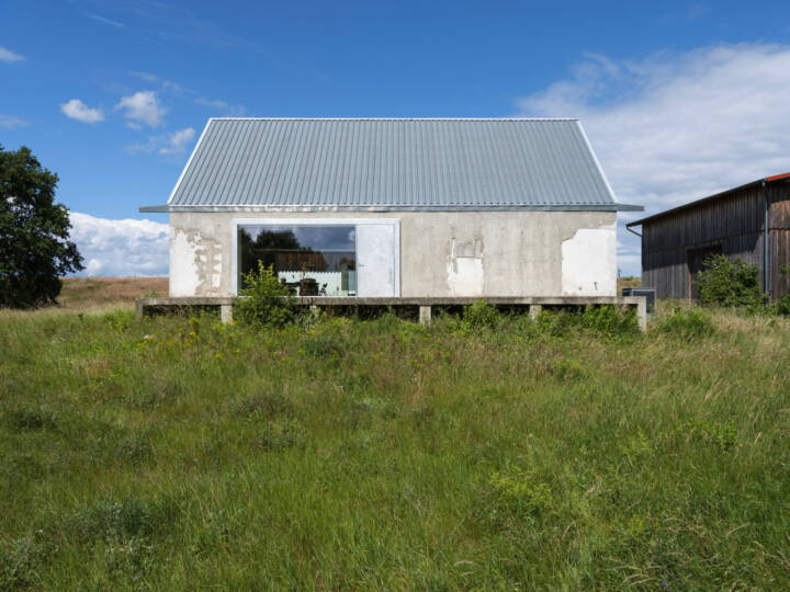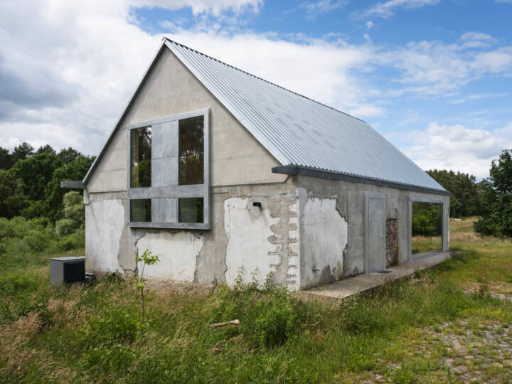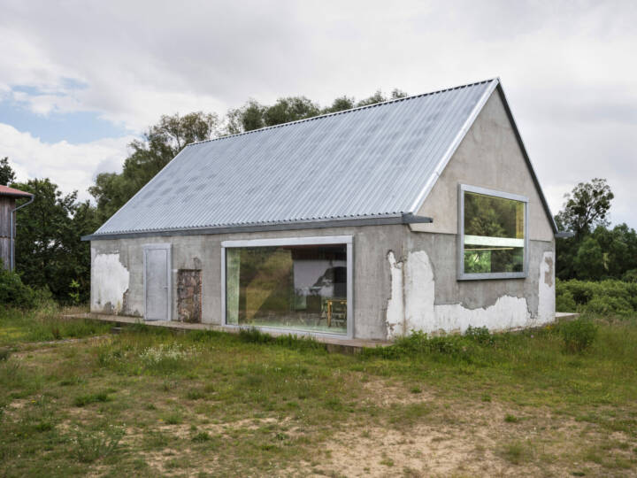 Located north of Berlin, the Uckermark region is renowned for its natural beauty and eco-friendly farms, which supply high-quality products to the Berlin area. Recently, it has also become a retreat for artists and creatives seeking an escape from the busy city. This project began with the planned restructuring of a small farm, where each building is set to be restored in stages. The existing family house, the only non-original building, was built atop an ancient ruin and followed a cost-effective construction standard before being demolished. AAS carefully removed the modern layers, preserving only the historic remnants of the walls. Thick concrete walls were then poured over these fragments to form a new structure. One large opening was created on each facade, offering a distinctive sense of scale and transforming the house’s appearance. The windows, which also function as doors, are strategically placed to maximise natural light in every room. Inside, the layout is open and fluid, with no interior doors. The space features a spacious living area with an open kitchen, and a staircase leading to two bedrooms.