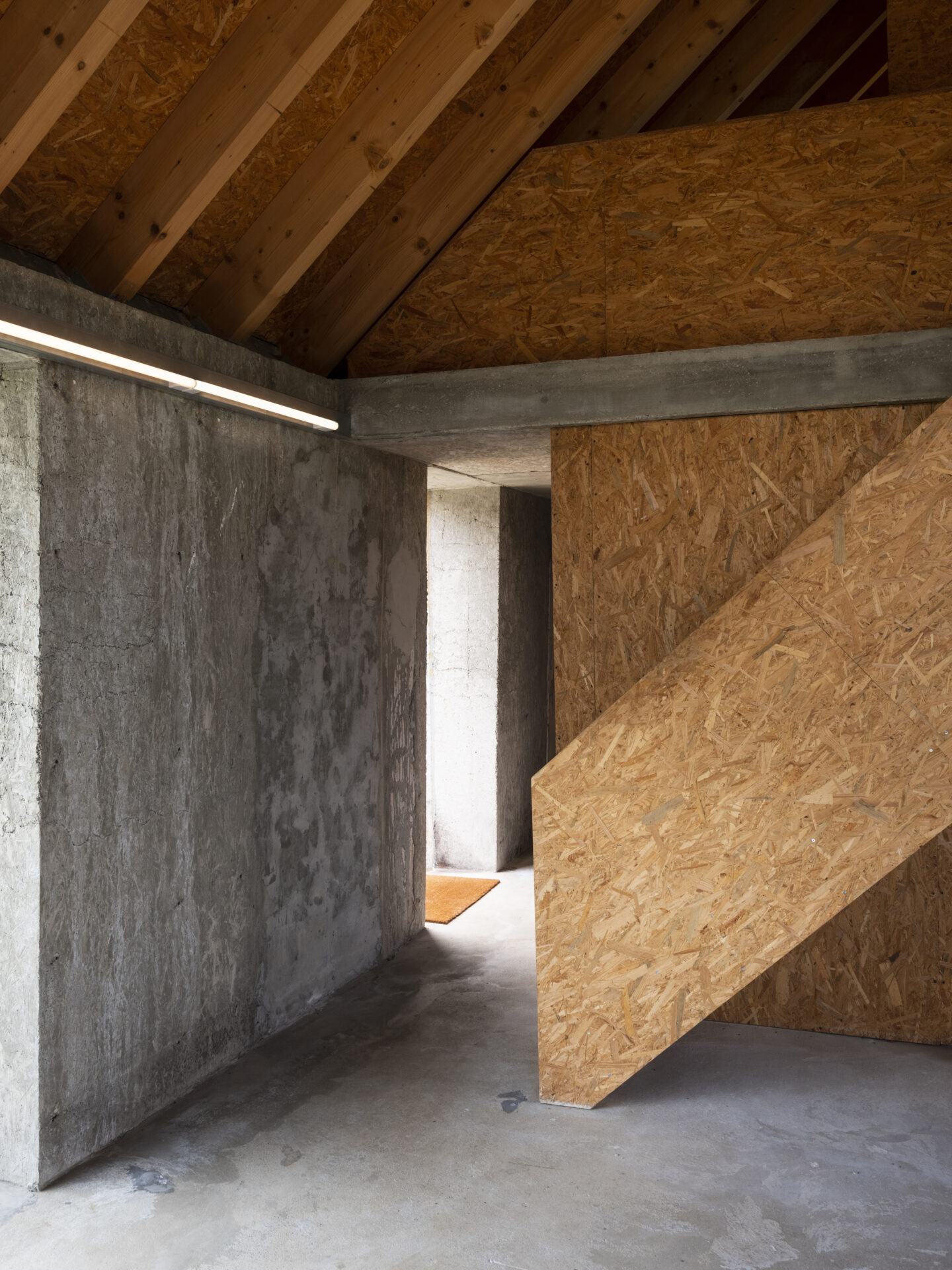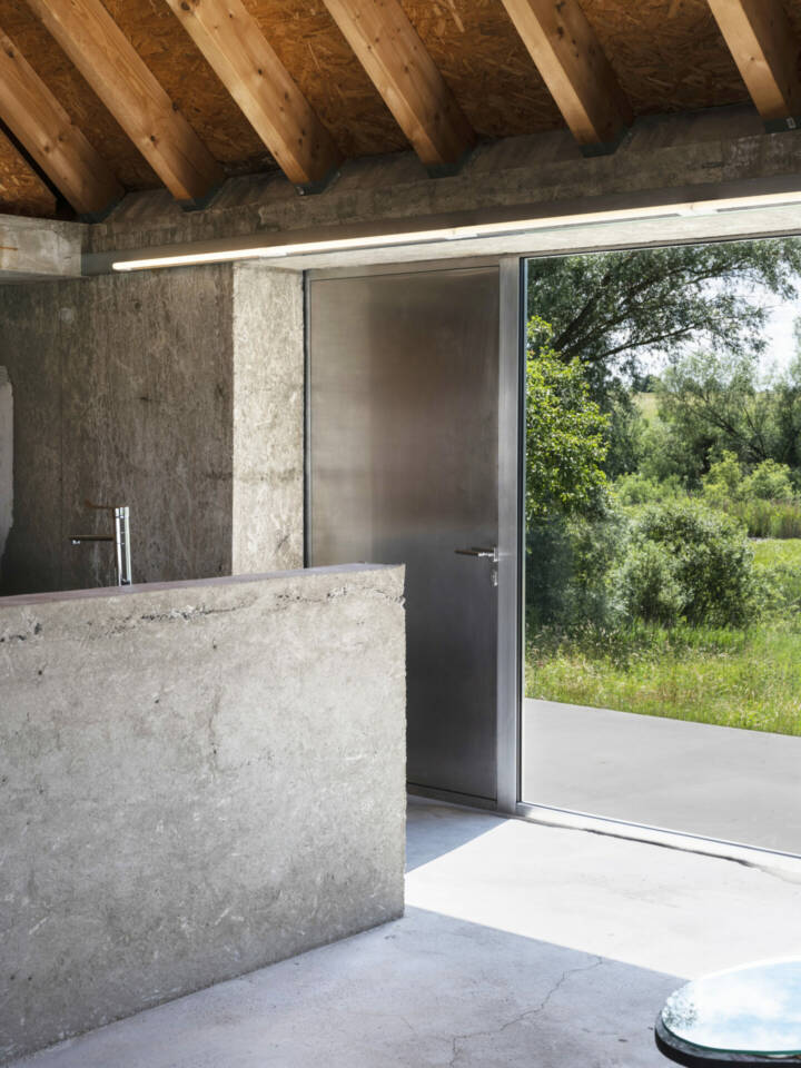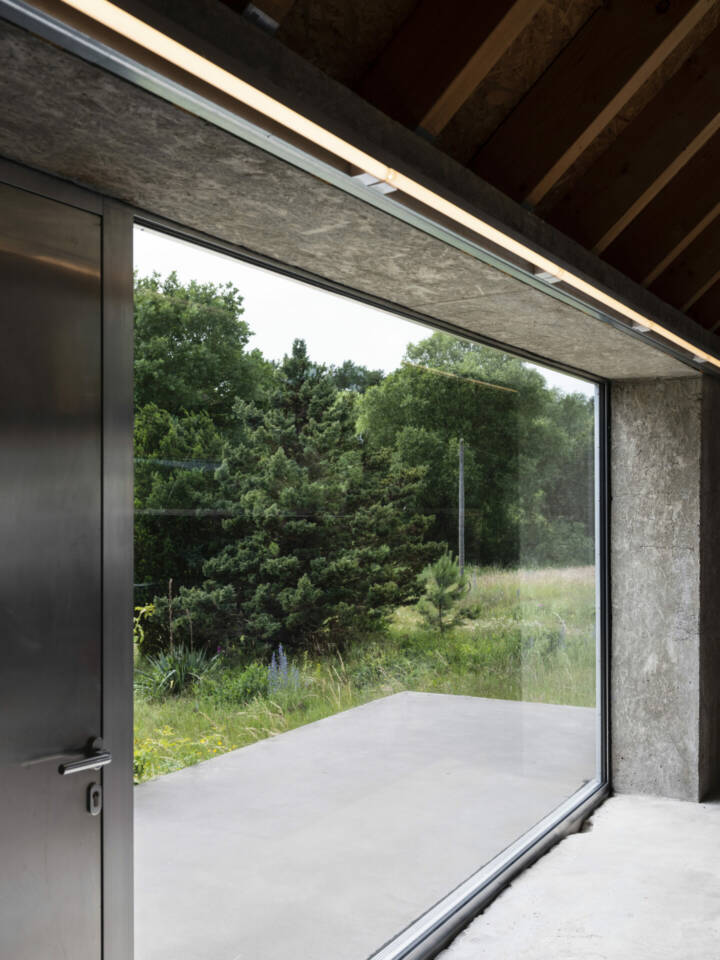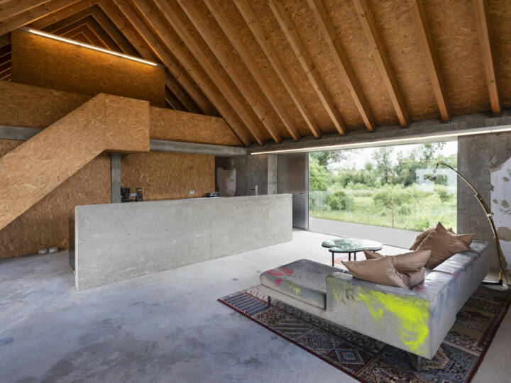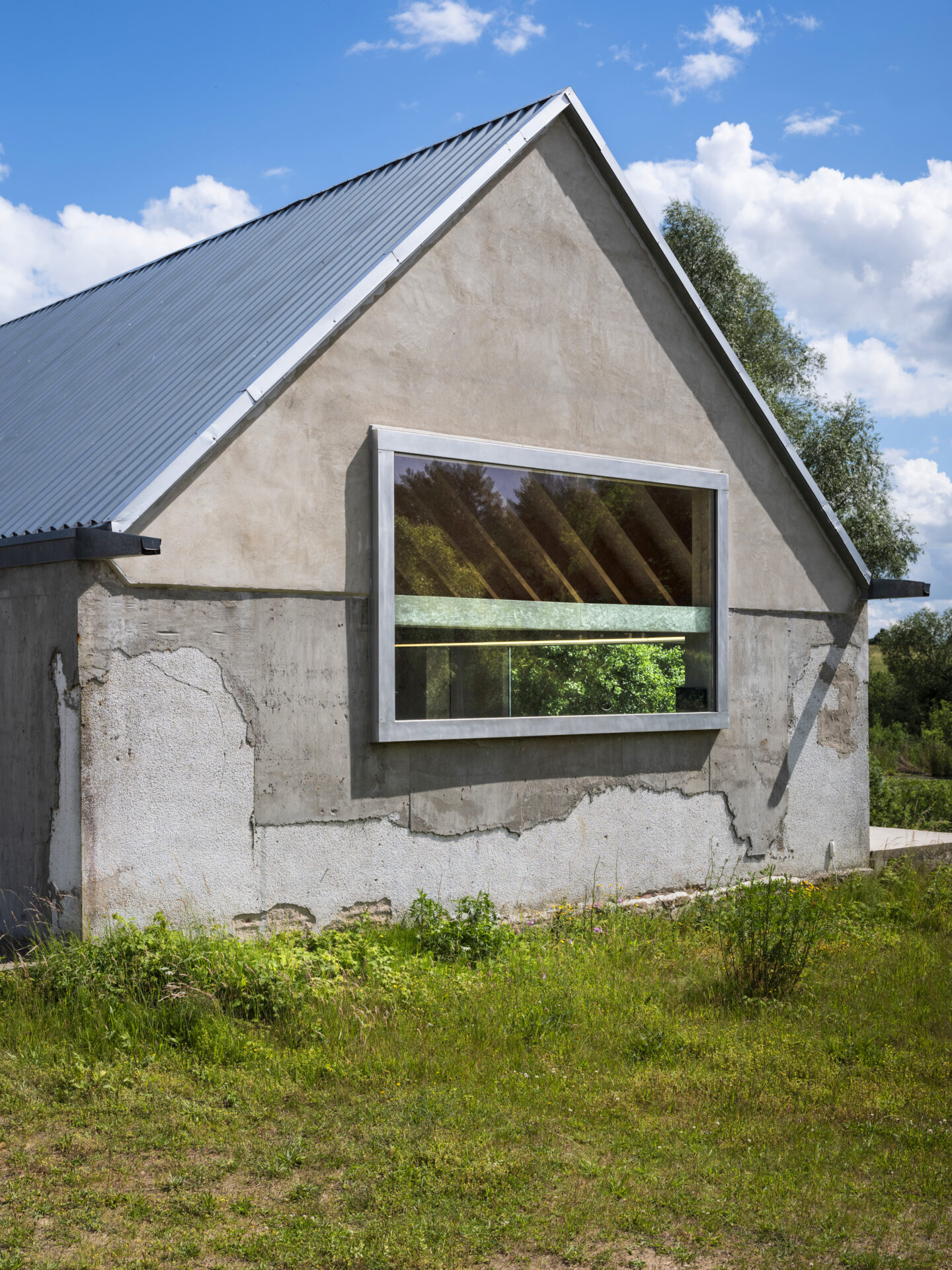 Located north of Berlin, the Uckermark region is renowned for its natural beauty and eco-friendly farms, which supply high-quality products to the Berlin area. Recently, it has also become a retreat for artists and creatives seeking an escape from the busy city. This project began with the planned restructuring of a small farm, where each building is set to be restored in stages. The existing family house, the only non-original building, was built atop an ancient ruin and followed a cost-effective construction standard before being demolished. AAS carefully removed the modern layers, preserving only the historic remnants of the walls. Thick concrete walls were then poured over these fragments to form a new structure. One large opening was created on each facade, offering a distinctive sense of scale and transforming the house’s appearance. The windows, which also function as doors, are strategically placed to maximise natural light in every room. Inside, the layout is open and fluid, with no interior doors. The space features a spacious living area with an open kitchen, and a staircase leading to two bedrooms.